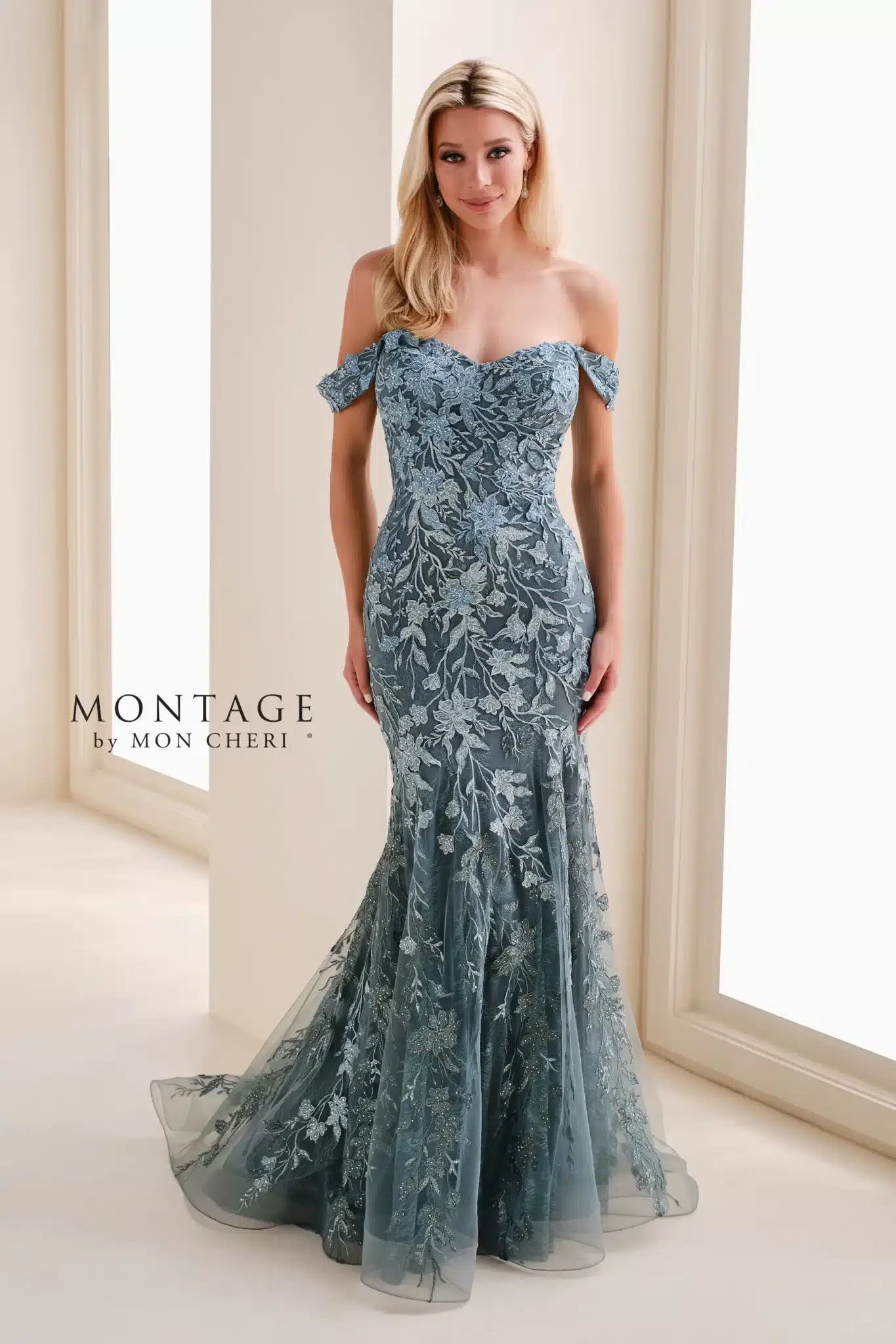 A romantic off-the-shoulder fit and flare gown adorned with intricate floral embroidery and delicate beadwork over tulle. Featuring a flattering sweetheart neckline, detachable off-the-shoulder straps, and a matching embellished tulle shawl for added elegance.