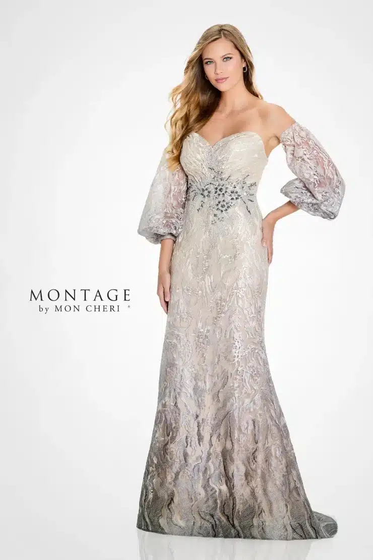 Sweetheart neckline and off-shoulder long balloon sleeves. The fitted bodice is embellished with a fully beaded belt. The natural waistline follows a full-length skirt with a swirl sweep. The dress is adorned with embroidered lace details throughout.
