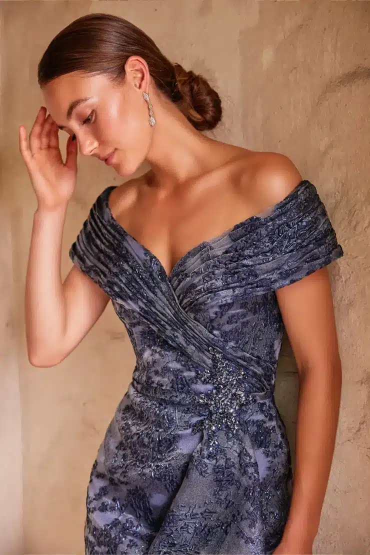 Off-shoulder neckline that accompanies the sagging ruched sleeves on the arms. The fitted bodice has a belt with glitter embroidery details near the waistline. It follows a full-length skirt with a structured knee-high slit. Shawl included.