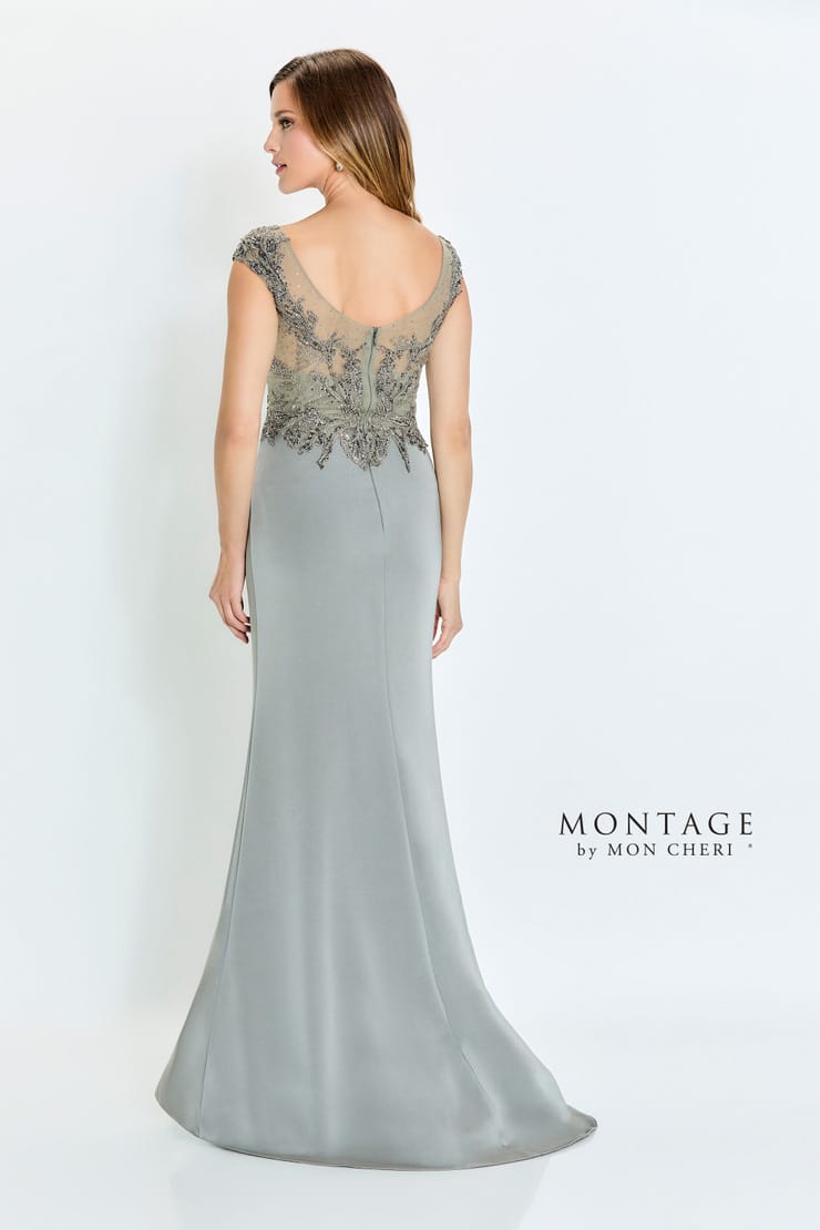 Tip-of-the-Shoulder beaded lace bodice with v neckline. crepe draped skirt with slit.