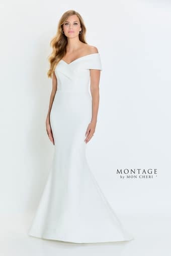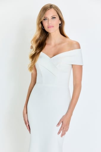 Crepe off shoulder fit/flare gown with a sweetheart neckline.