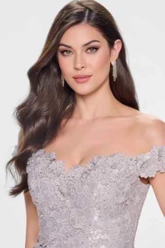 Embrace timeless elegance with this exquisite off-the-shoulder style. Crafted from luxurious Mikado, this gown is adorned with floral lace appliqués that cascade down from the sweetheart neckline, highlighting your silhouette with their delicate detailing. The fitted bodice seamlessly transitions into a flared skirt, creating a mermaid-like effect that is both flattering and dramatic