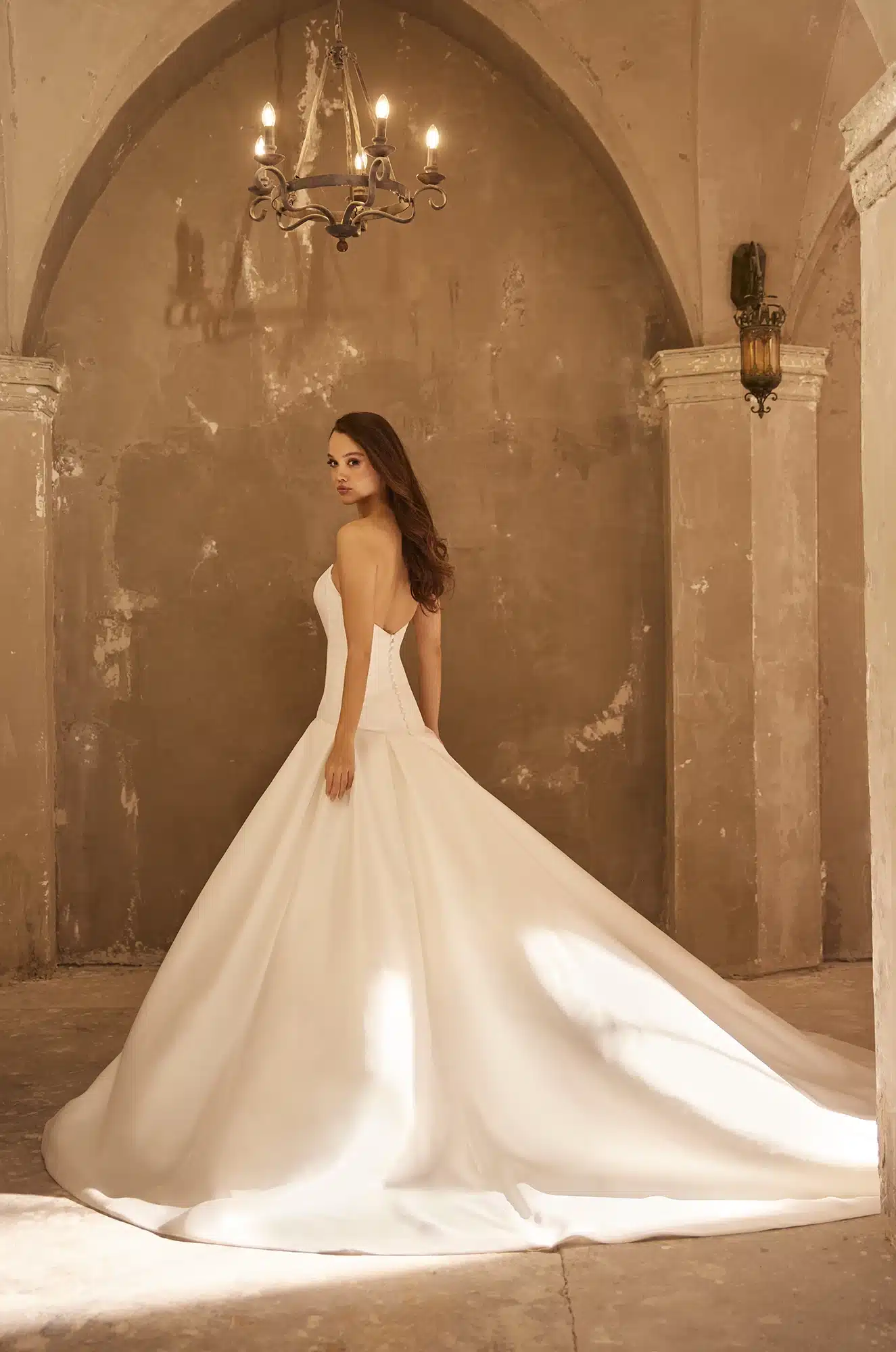 Introducing Style P5100, a masterpiece of elegance and sophistication. Crafted from luxurious Mikado fabric, this strapless gown features a drop waist bodice adorned with princess seams, leading to a timeless scoop neckline. Delicate fabric-covered buttons grace the center back, adding a touch of vintage charm. The voluminous box-pleated skirt creates a striking silhouette, perfect for the modern bride seeking both grace and grandeur.