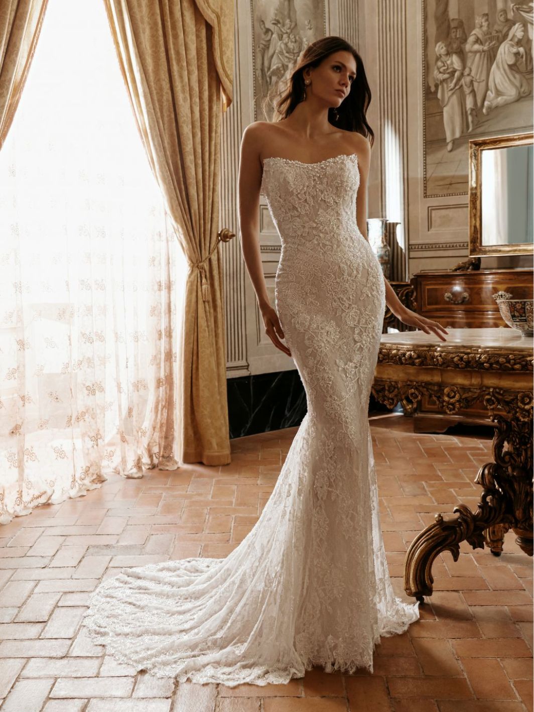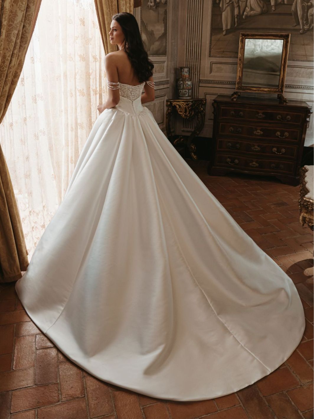Ednah by Pen.Liv is a stunning two-in-one design that blends sleek sensuality with grand bridal drama. The fitted lace gown features intricate beaded detailing that contours the body, while the structured corset and detachable Mikado overskirt create a dramatic ballgown silhouette. Finished with delicate beaded straps, Ednah offers a seamless transition from ceremony to reception.