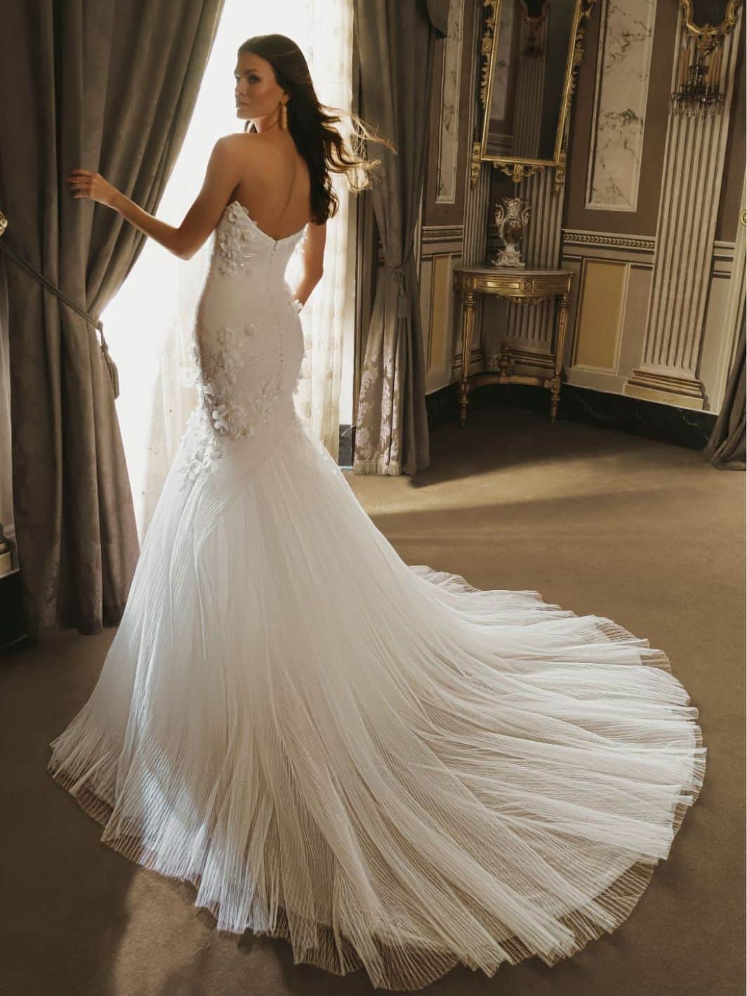 Elise by Pen.Liv is a dreamy, fashion-forward mermaid gown that captures movement and texture in every detail. The strapless sweetheart bodice is adorned with sequinned 3D floral appliqués, cascading into a sculpted silhouette that flares into a voluminous pleated tulle skirt with a soft shimmer of glitter. Romantic, modern, and effortlessly captivating.