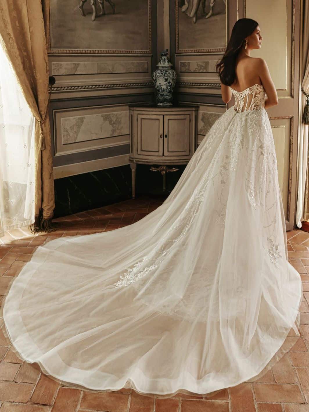 Emori by Pen.Liv is a breathtaking two-in-one gown that blends sculpted elegance with ethereal volume. The intricately beaded lace fit-and-flare silhouette contours the body, while a dramatic detachable tulle overskirt adds soft, sweeping movement and grandeur. Designed for versatility, Emori effortlessly transforms from a statement ceremony look to a sleek, modern reception style.