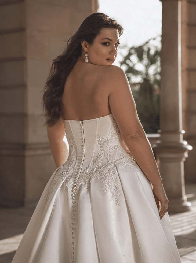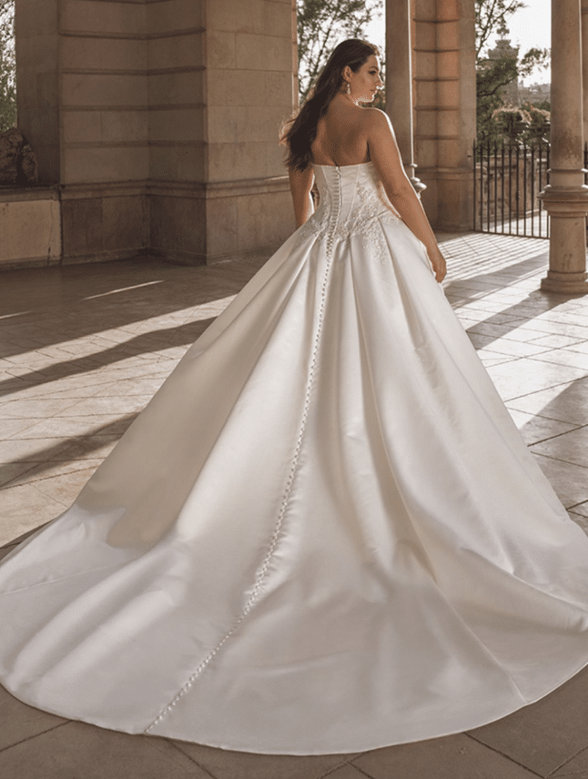 Introducing the ethereal Portrait x Geneva wedding gown from the Portrait collection. Crafted in luxurious satin, this regal ballgown silhouette enchants with its dreamy scoop neckline and ornate detailing of beaded accents and a row of buttons down the train. The sculptural back adds a modern twist to this timeless piece, perfect for a bride seeking a playful yet sophisticated look on her special day.