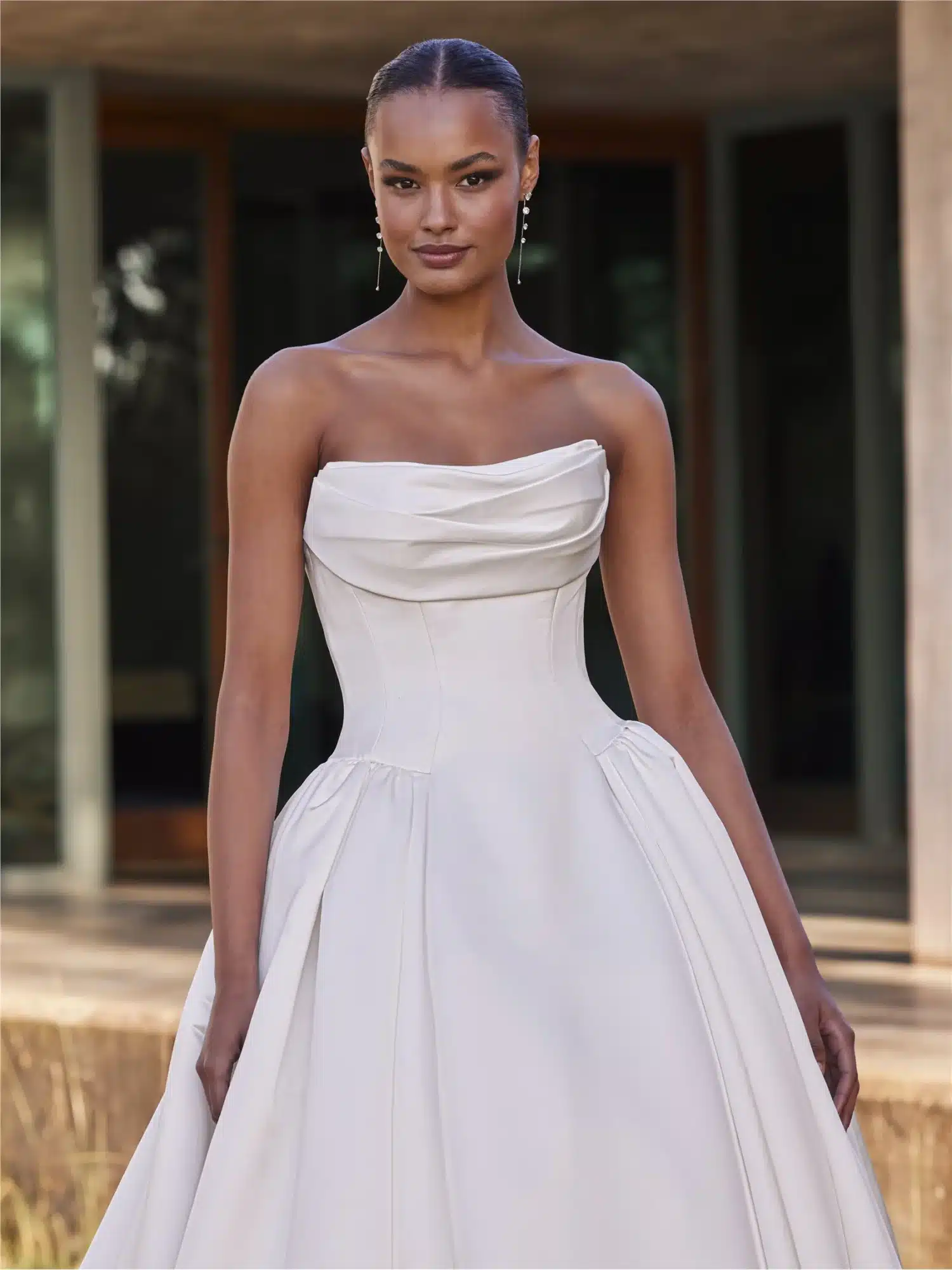 A strapless princess gown with a dramatic ballgown shape, crafted from satin. Perfect for brides looking for opulence and a commanding presence.