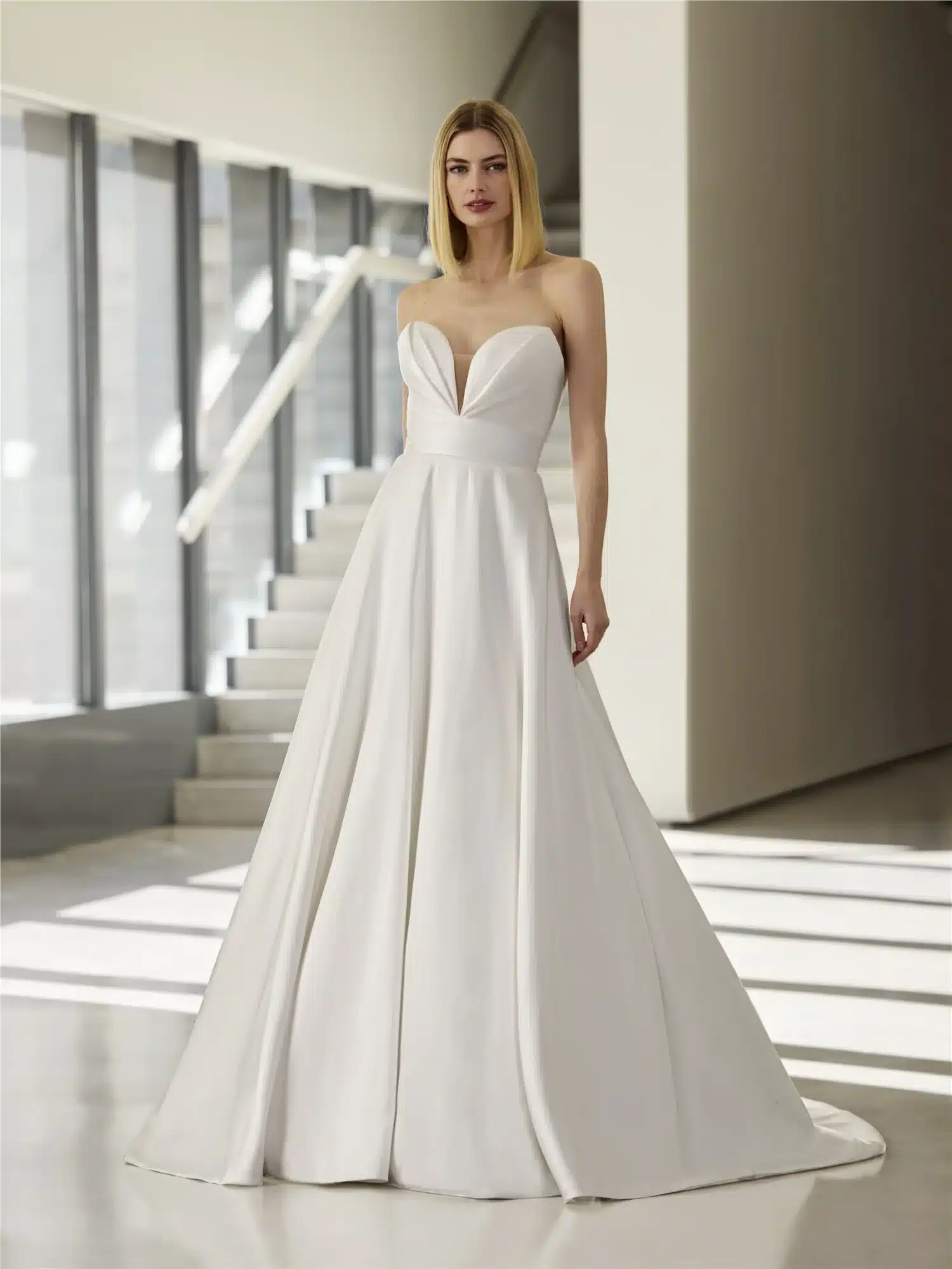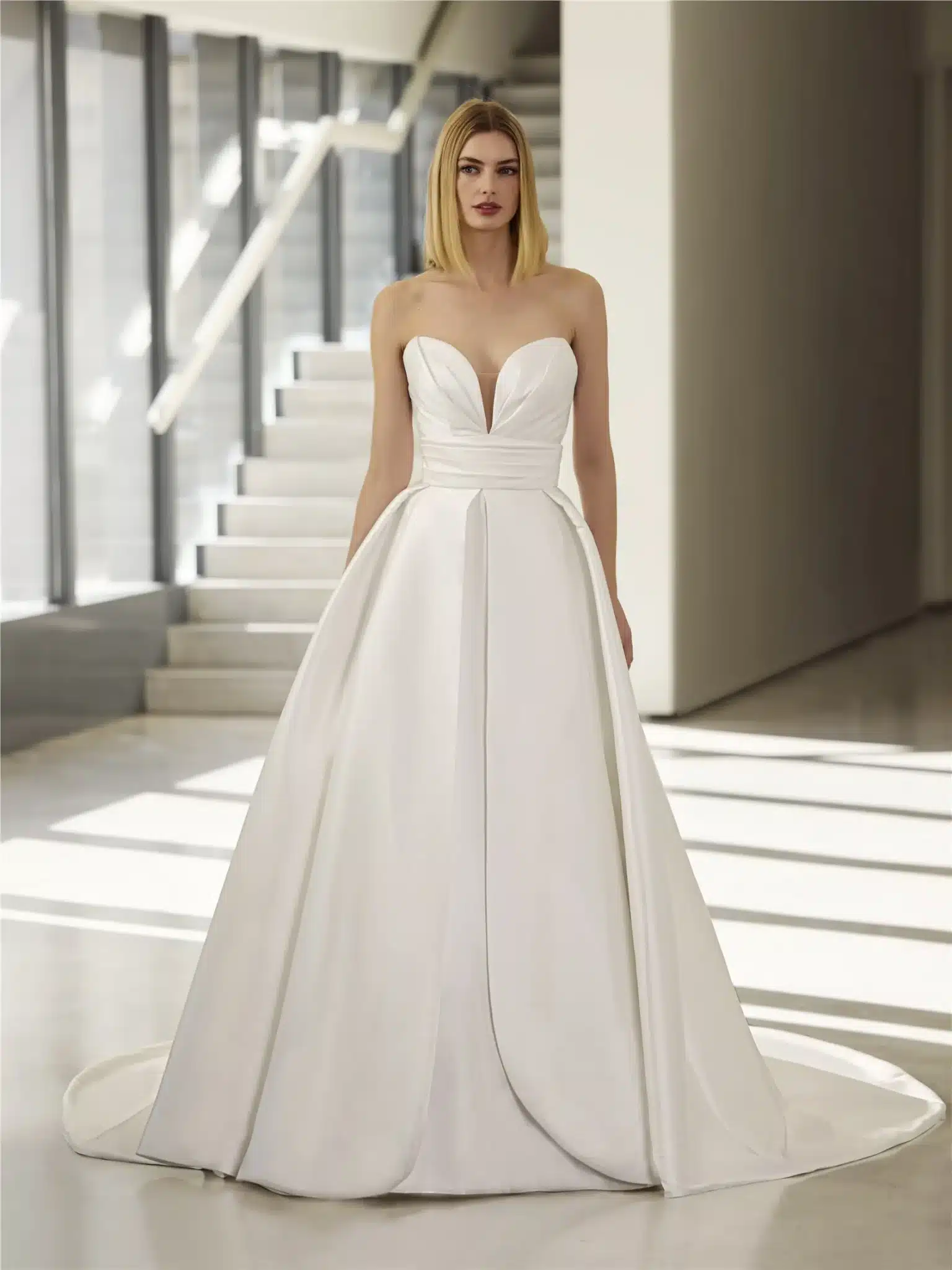 A-line dress with a sweetheart neckline in soft mikado, representing a dramatic volume with a commanding, elegant presence.
