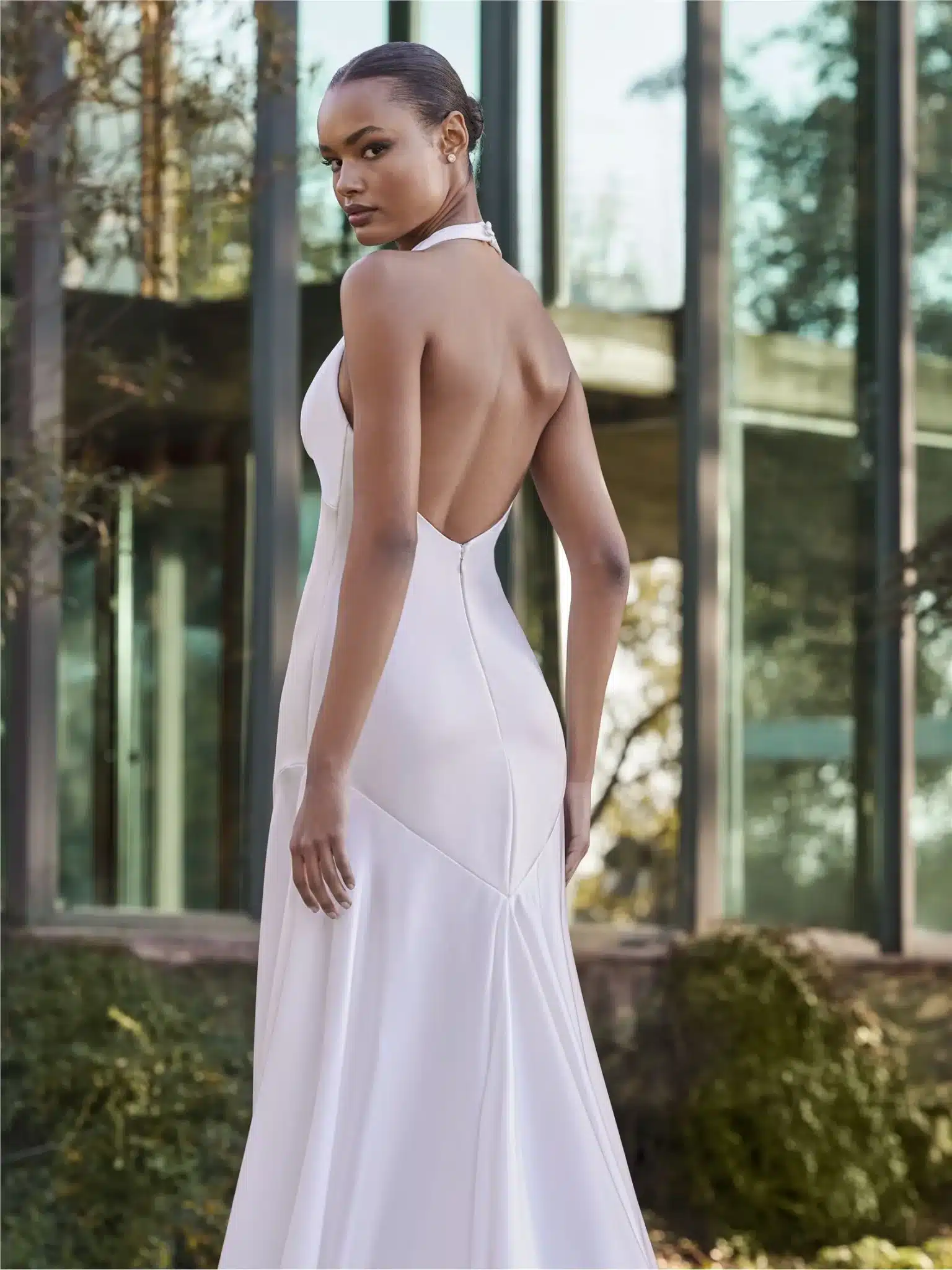 A mermaid gown with a halter neckline, embodying breathtaking minimalism. Made from satin, it offers sleek, chic sophistication for the stylish bride.