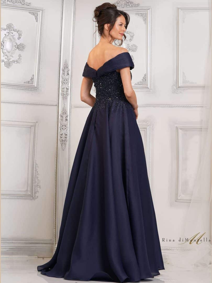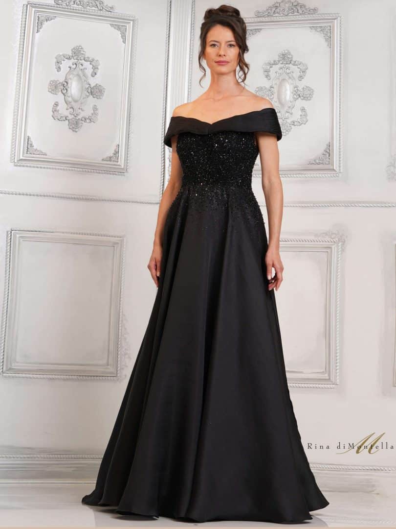 This 46″ luxurious shimmer A-line gown features an off-the-shoulder portrait collar and a beautifully beaded bodice.