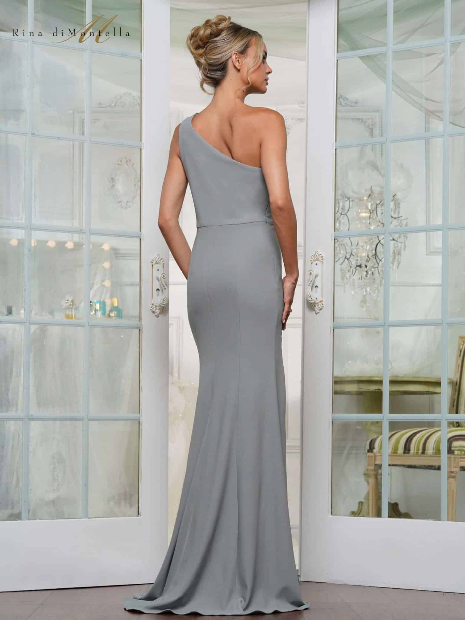 This one-shoulder stretch crepe fit and flare gown is adorned with beaded floral embroidery appliqué, offering a striking blend of modern elegance and intricate detail.