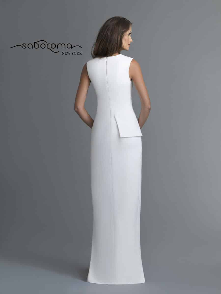 Scuba crepe queen ann gown with a sweetheart neckline and a side peplem.
