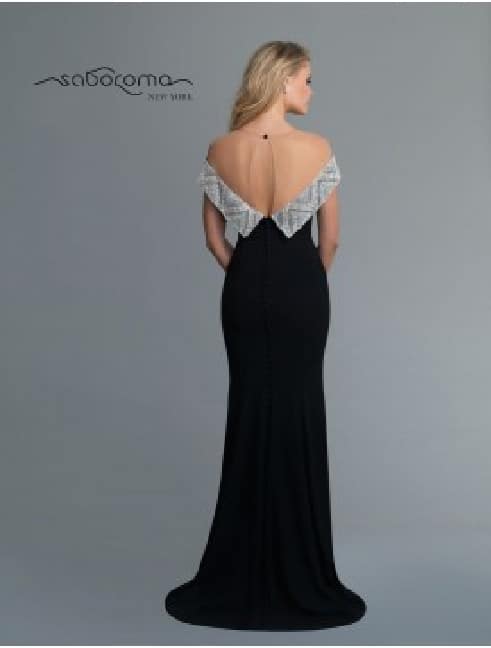 Crepe sheath illusion yoke neckline with off shoulder beaded band becomes v neckline back covered buttons back side slit.