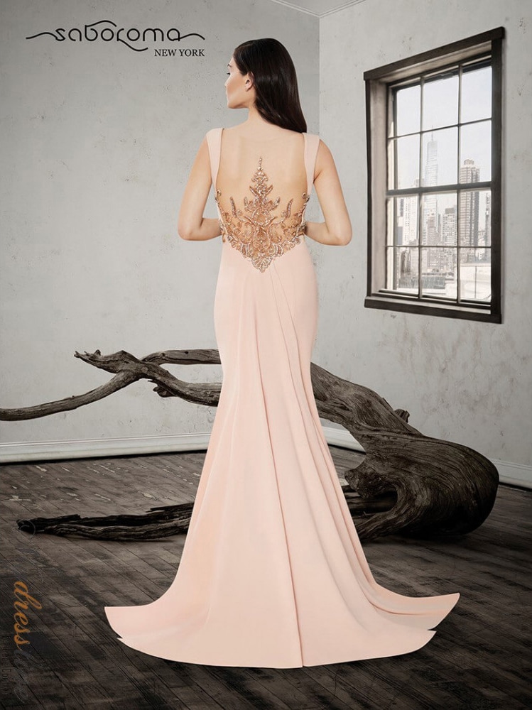 Sleevelss jersey stretch gown with illusion low back detail and beaded applique.