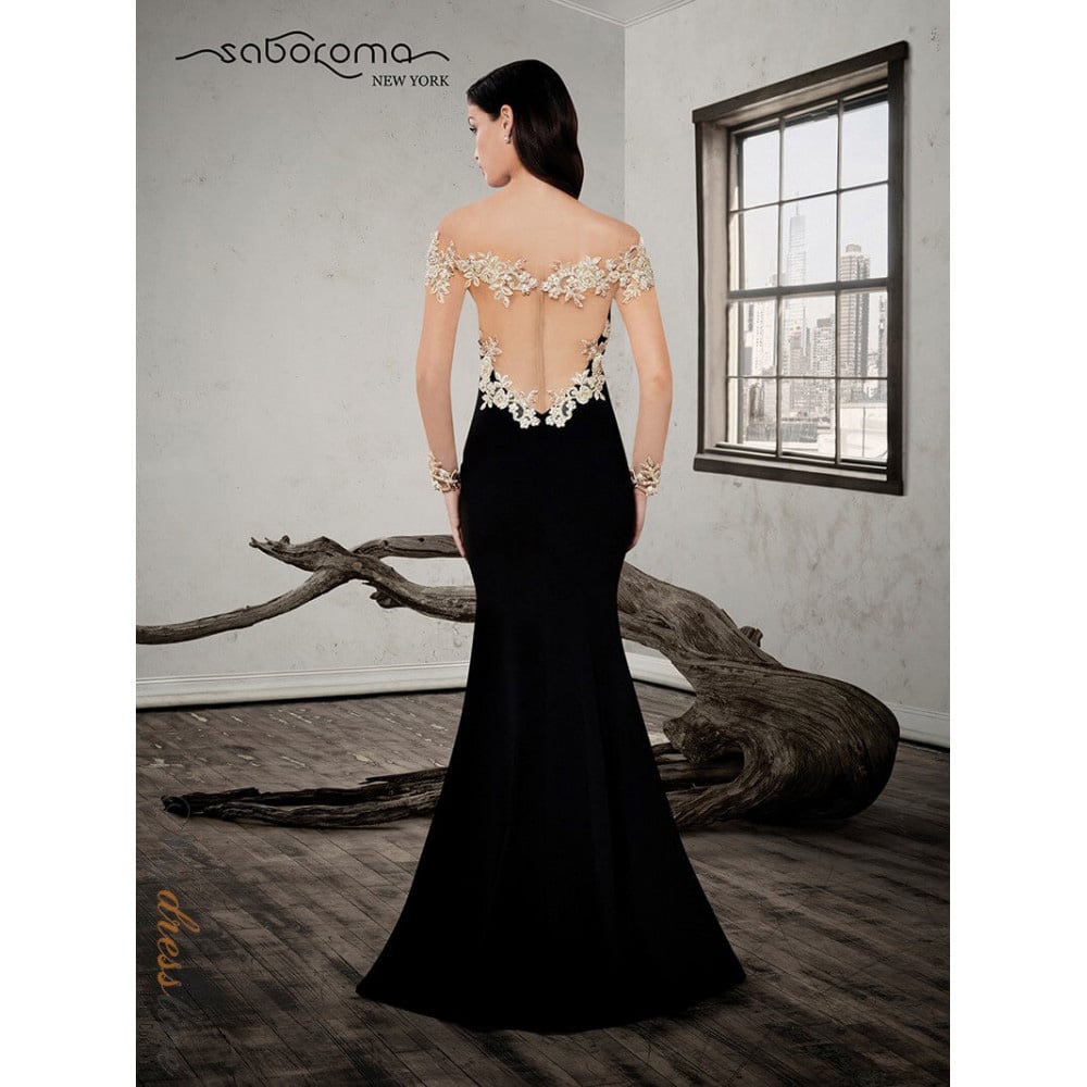 Beaded floral appliques on illusion neckline, long sheer sleeves with appliques on cuff.