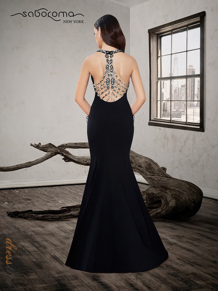 Stretch jersey gown with heavy beaded neckline and at the pocket.