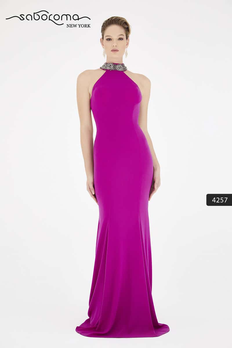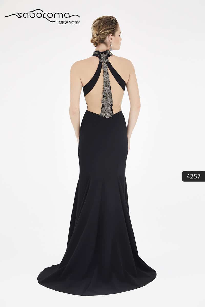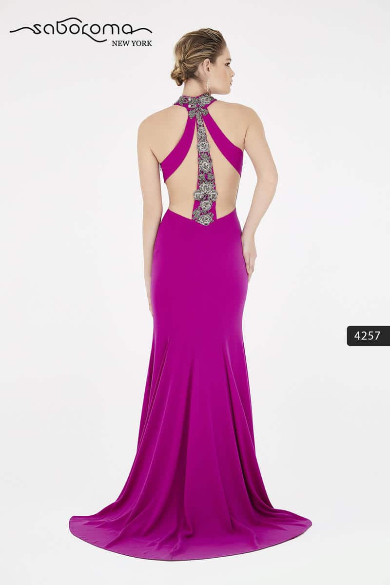 High neckline racer back fitted dress with beaded applique on neck and back.