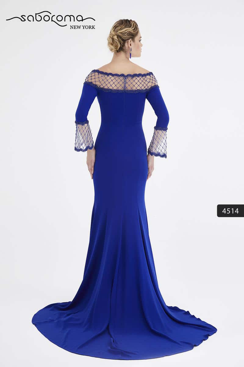 Long sleeve scoop neck dress with illusion with beading at neckline and at the end of sleeves, crepe trumpet with sweep.