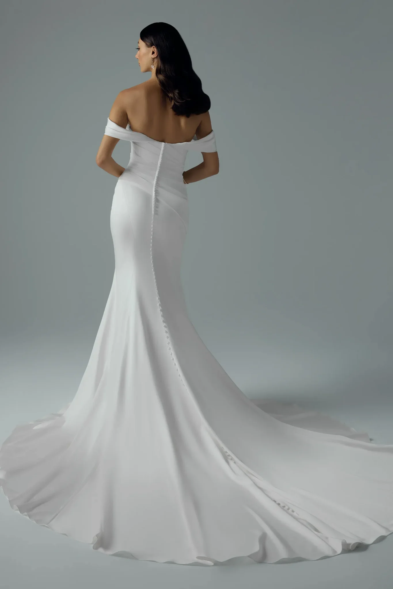 Understated and effortlessly elegant, Ava is the definition of refined beauty. Crafted from luxurious satin, her fit-and-flare silhouette is elevated by thoughtfully placed asymmetrical draping that contours the bodice and draws the eye to the natural waistline. Her scoop neckline is framed by off-shoulder straps that wrap gracefully across the upper bodice, creating a sculptural, modern look from every angle. The asymmetrical draping continues along the back, intentionally designed to enhance your curves. Her skirt falls cleanly with a soft, sheath-like quality, while fabric-covered buttons trail from the top of the back bodice to the edge of her chapel-length train; a timeless finish. Ava is sleek, sophisticated, and made for the minimalist bride who values meaningful design.