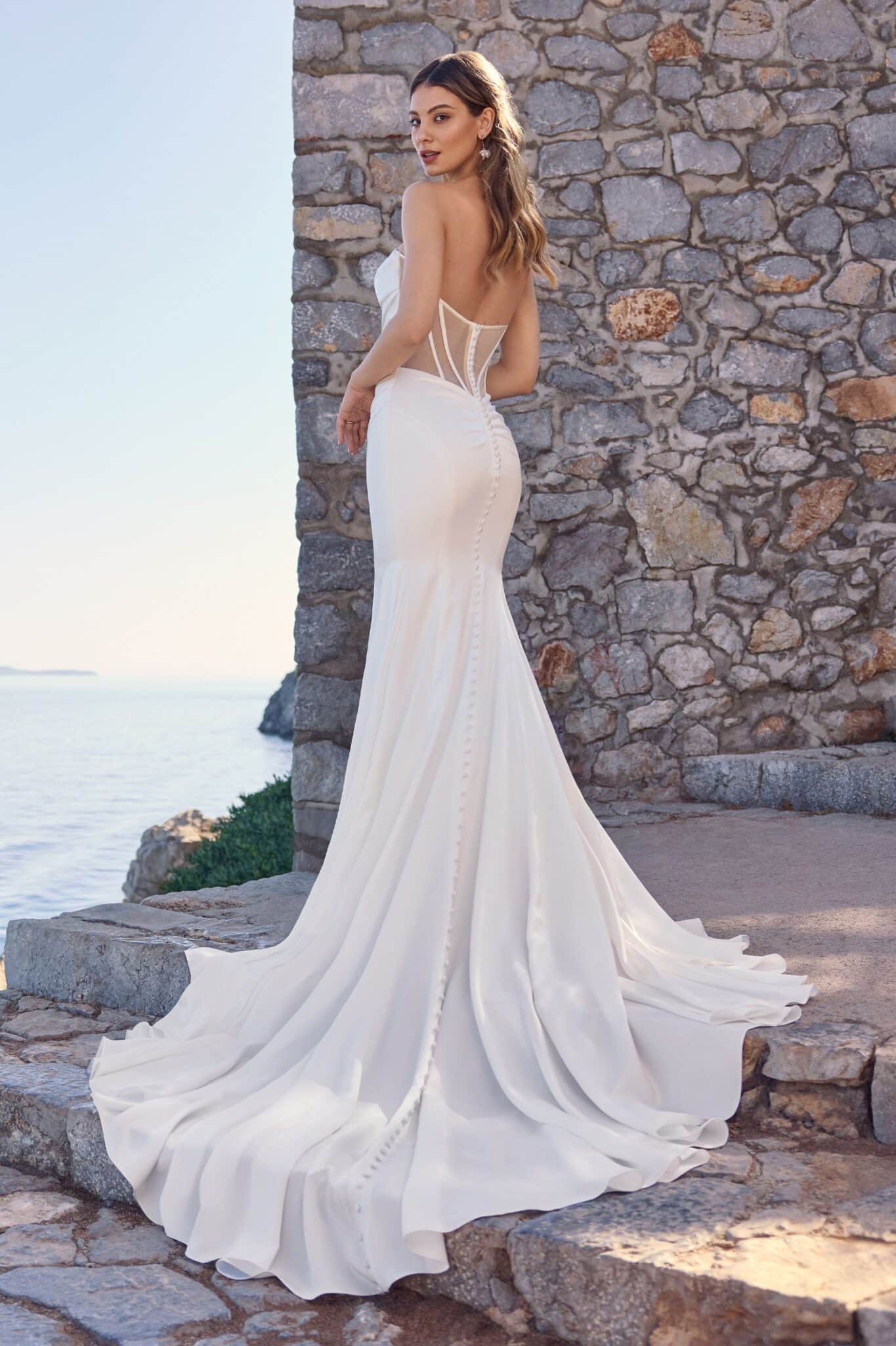 Modern romance meets vintage glamour in this incredibly flattering fit-and-flare gown! Her bodice and upper skirt feature artful draping, drawing the eye to the natural waist and creating a captivating silhouette. Joslyn embraces modern romance with her daring skirt slit, adding a touch of allure to her classic fit-and-flare design. Joslyn is sure to turn heads as you walk down the aisle with illusion boning in her back bodice, a detail the modern bride will fall head-over-heels in love with.