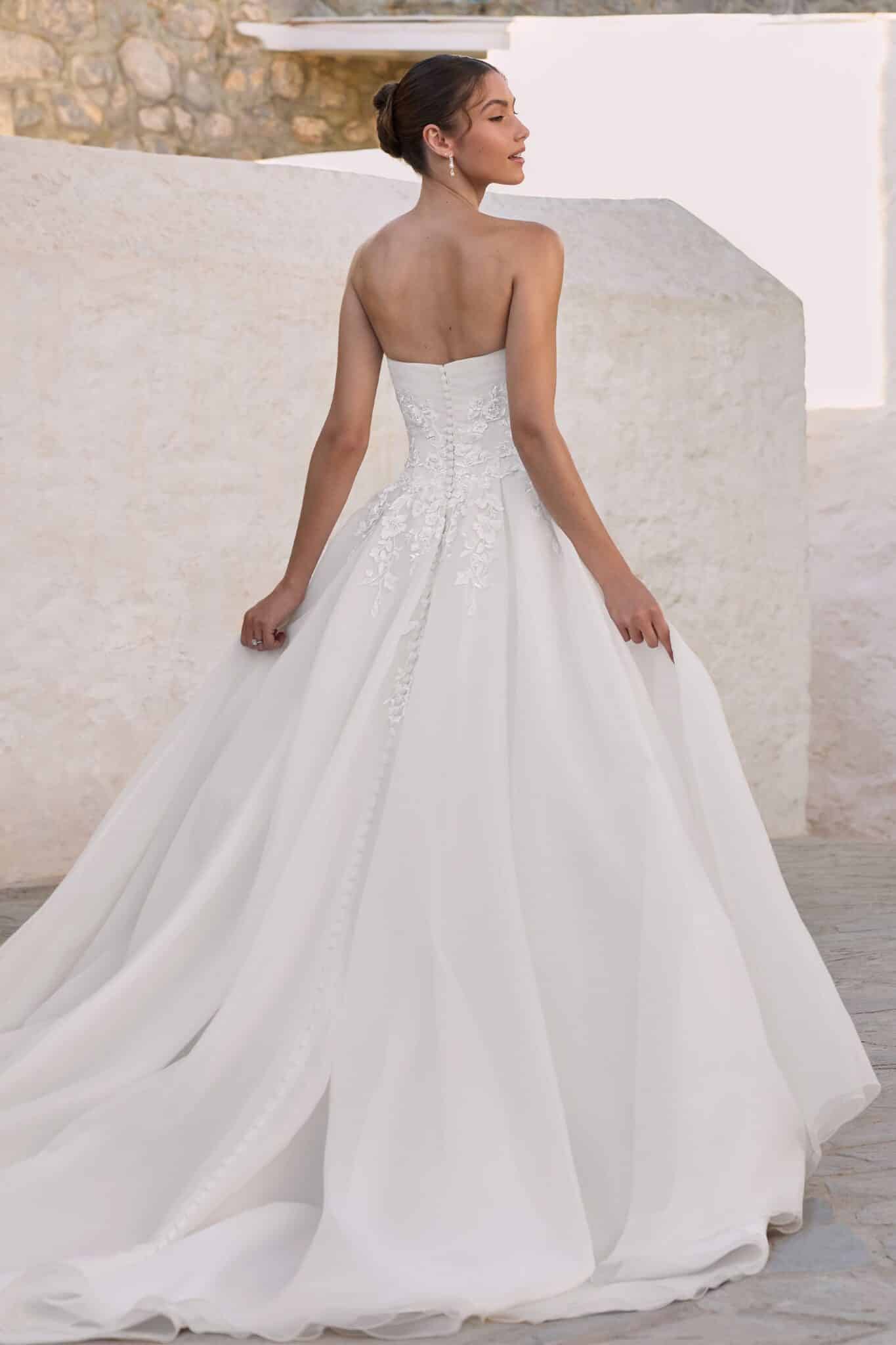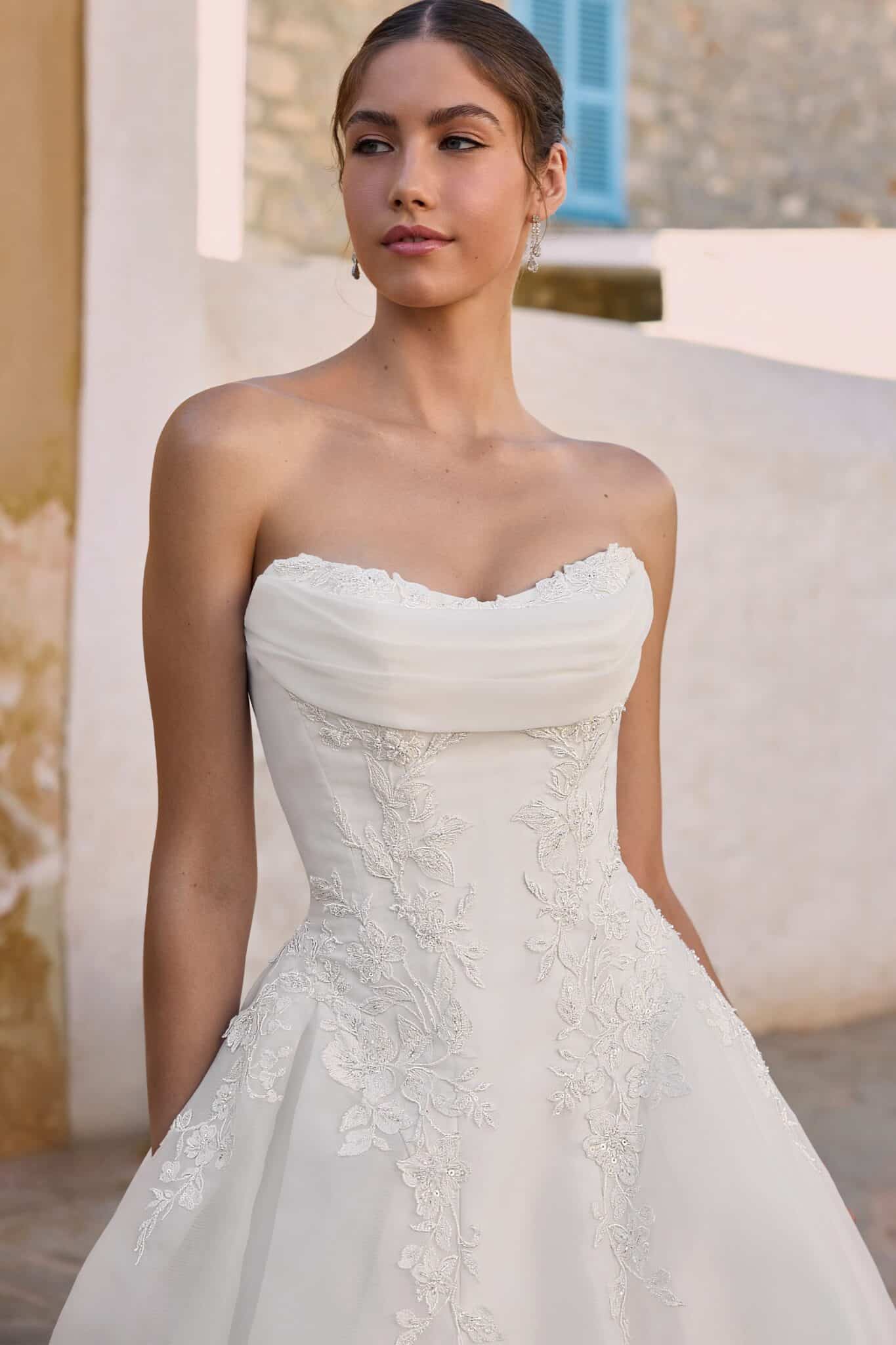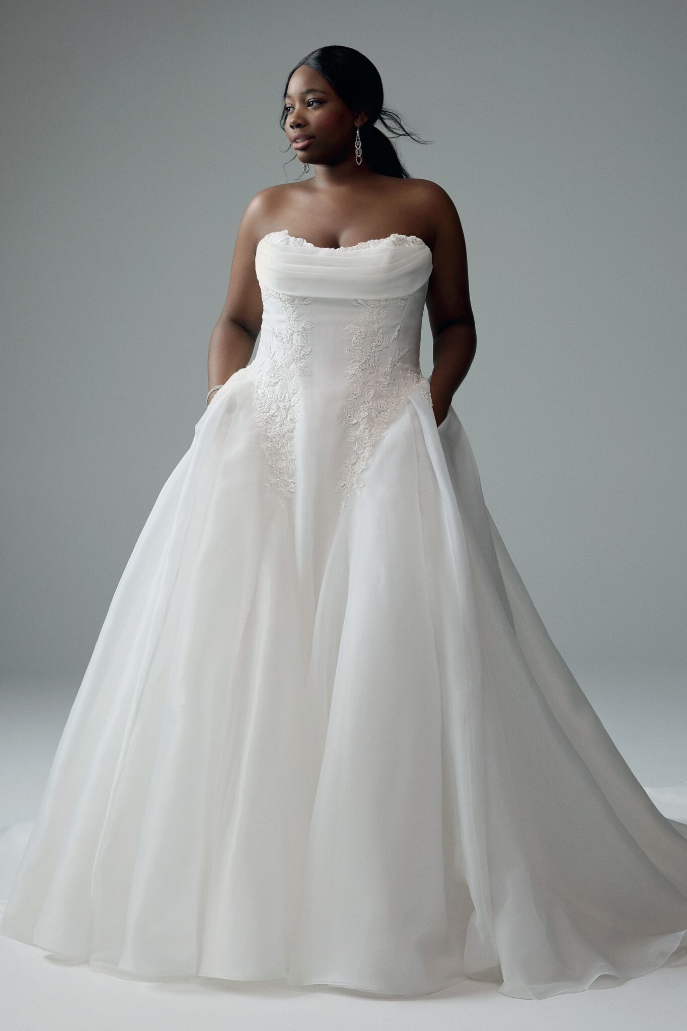 Say 'I do' in our strapless ball gown, Joy! This sleek, princess ball gown promises to bring your regal wedding dreams to life, crafted from luxurious organza. She represents all things modern, with her sexy, scoop neckline and bodice that features floral lace placed to contour the body. Her bodice is adorned with a distinctive touch—a panel of ruched organza set just below the neckline. Thought Joy couldn't get any better? She features hidden pockets to hold your bridal essentials on your wedding day!