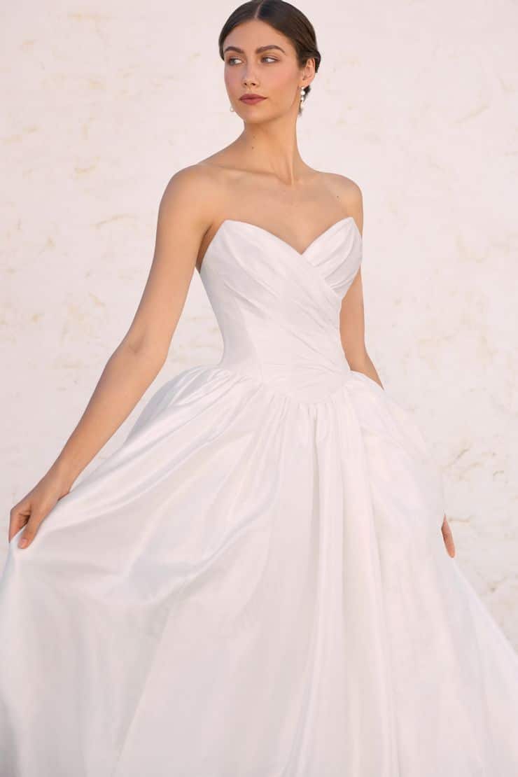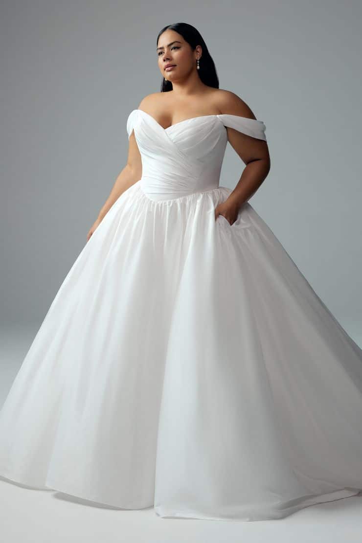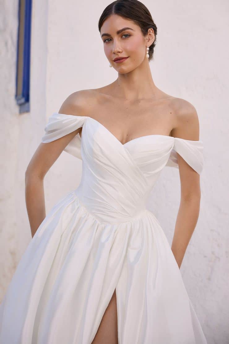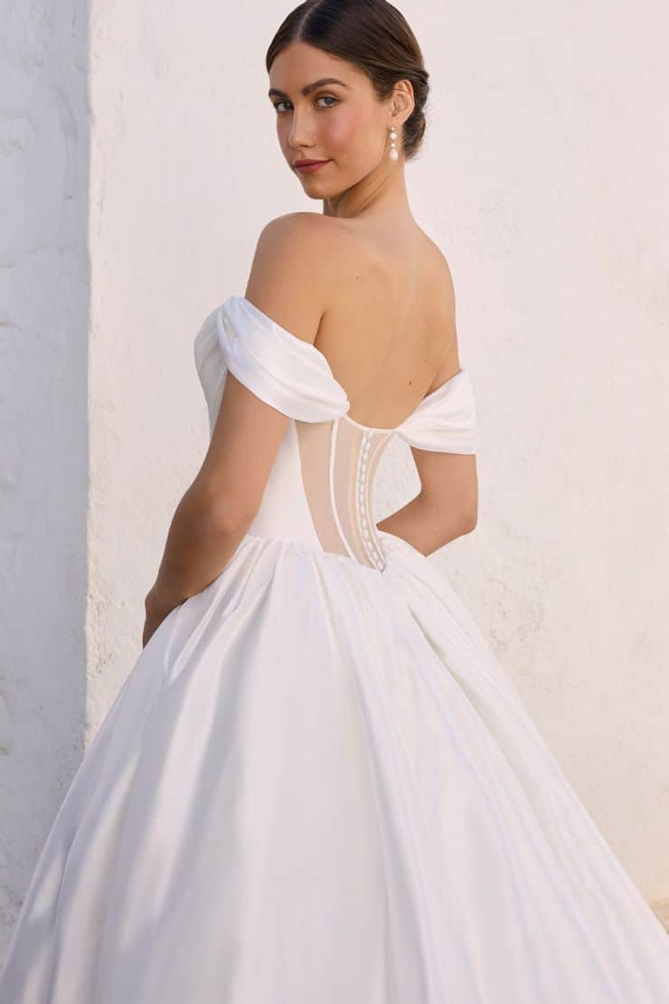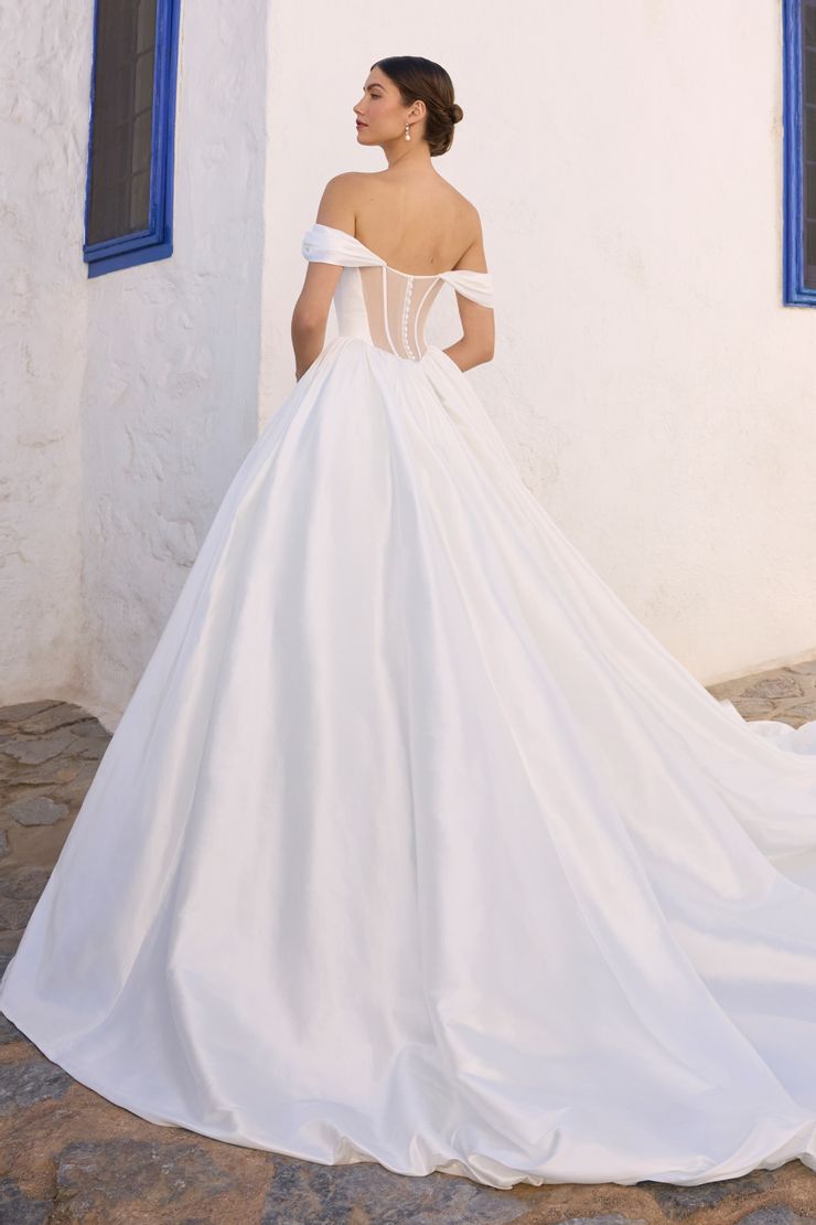 Kirby is a ball gown guaranteed to turn people's heads as you walk down the aisle. Her sweetheart bodice features delicate draping and elegant off-shoulder straps, amplifying her regal aesthetic. Kirby's grand ball gown skirt is voluminous and features a sexy leg slit that brings a touch of drama to the minimalist bridal look. The back of Kirby is just as magnificent as the front; the back bodice features sheer back panels with visible boning details and fabric-covered buttons that run down the entire chapel-length train. Feel like royalty in this gorgeous ballgown wedding dress!
