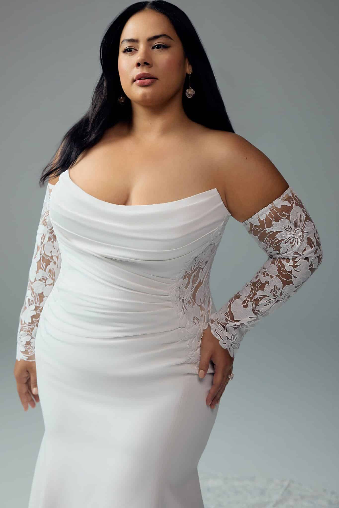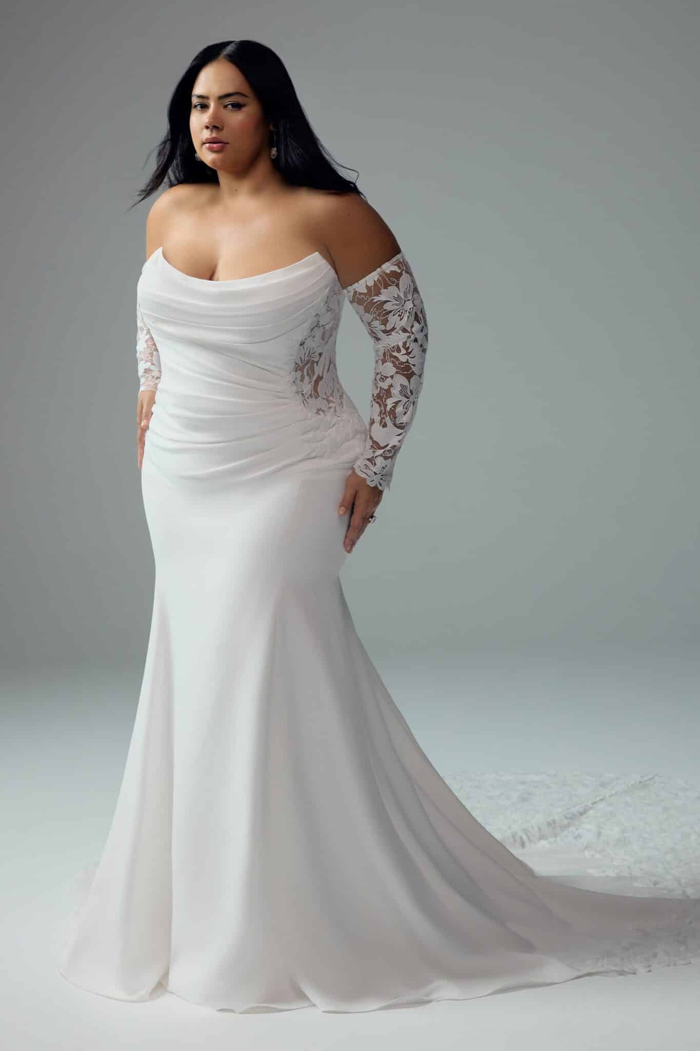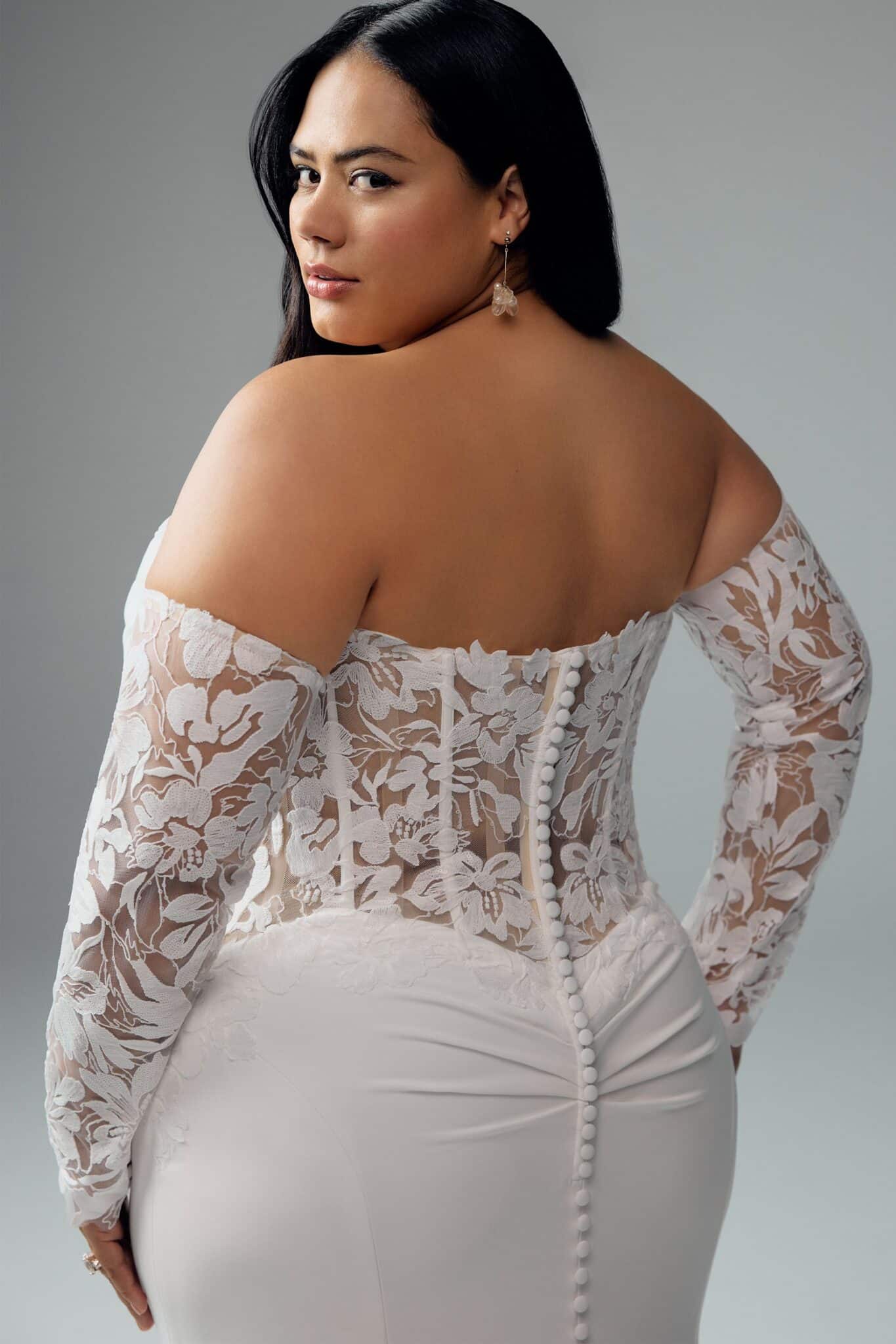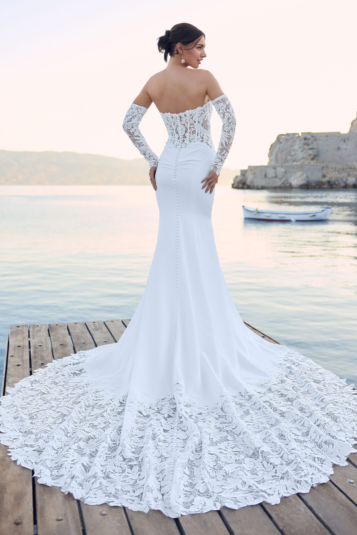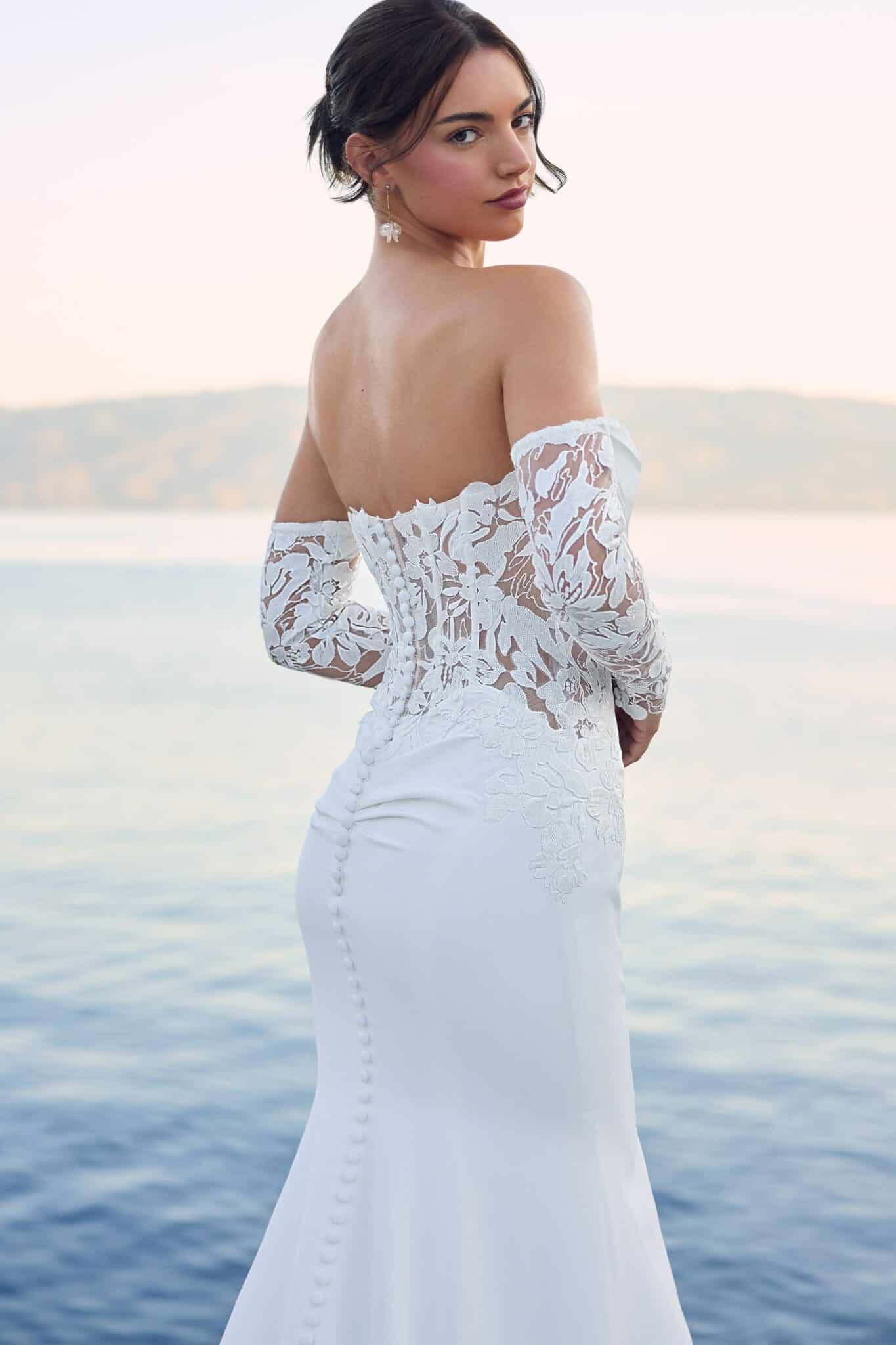 Looking for a dreamy, lightweight, crepe bridal gown with floral lace details? Lucie is just what you've been searching for! Her bodice features carefully curated draping that effortlessly draws the eye to the waist for the most flattering of looks. Her modern, soft scoop neckline and off-shoulder, long sleeves combine to create a sense of romance. The back of the gown is completely awe-inspiring with an illusion lace back, ruching, fabric-covered buttons, and a dramatic laser-cut train for a stunning entrance. Lucie is perfect for the chic, sophisticated bride.