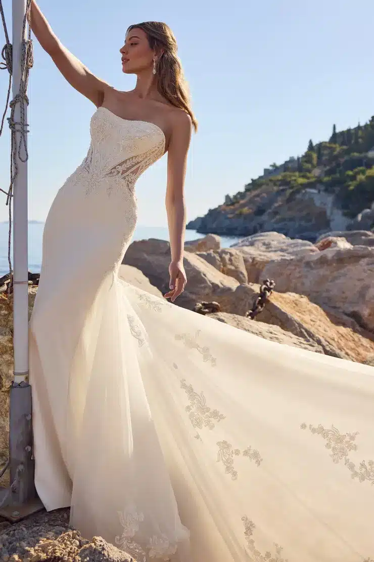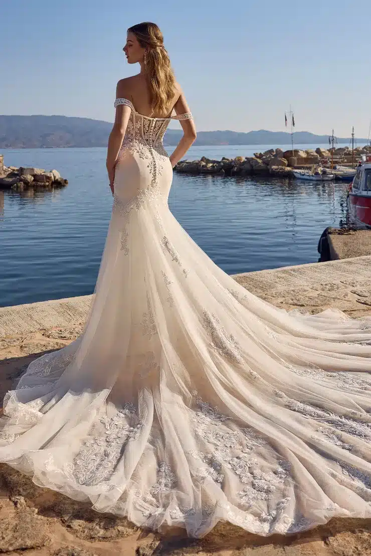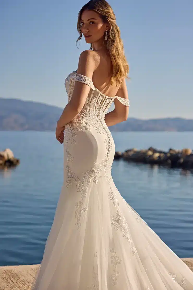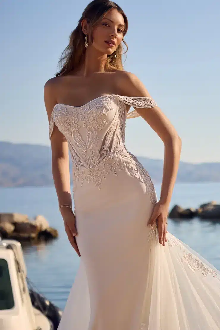 Make hearts race in our magnificent off-shoulder bridal gown, Mila. Crafted from royal crepe and misty tulle, Mila has a sexy fit-and-flare silhouette and a universally flattering sweetheart neckline with detachable lace off-the-shoulder straps. Her richly embellished bodice with sheer panel details is what will make brides fall in love with Mila. Lace appliqués trail down from the bodice to the shimmering tulle skirt, finishing the dress with fabric-covered buttons. The contrast between the crepe and tulle fabrics in Mila's skirt amplifies the drama in this sexy bridal gown! What's not to love?