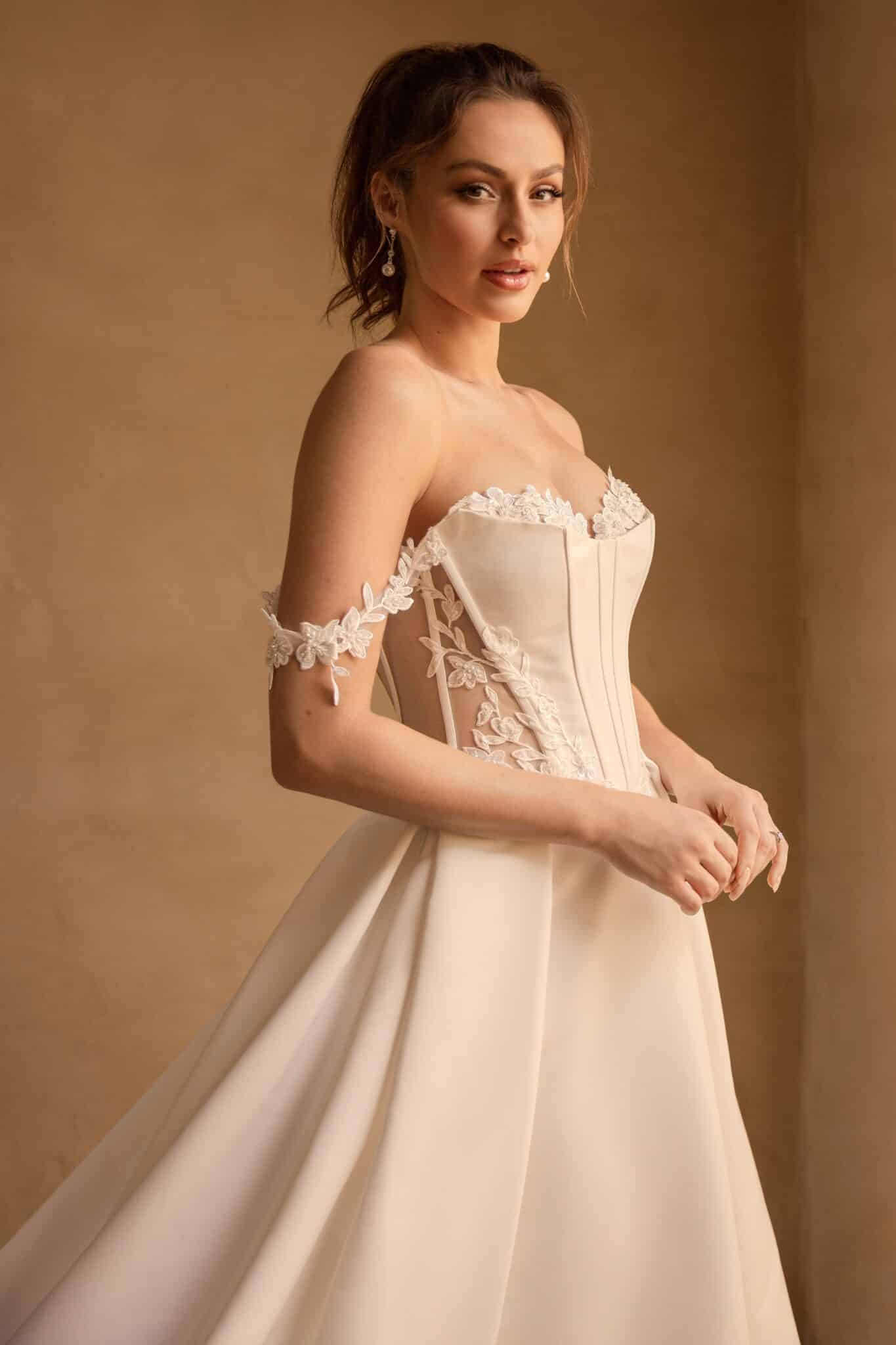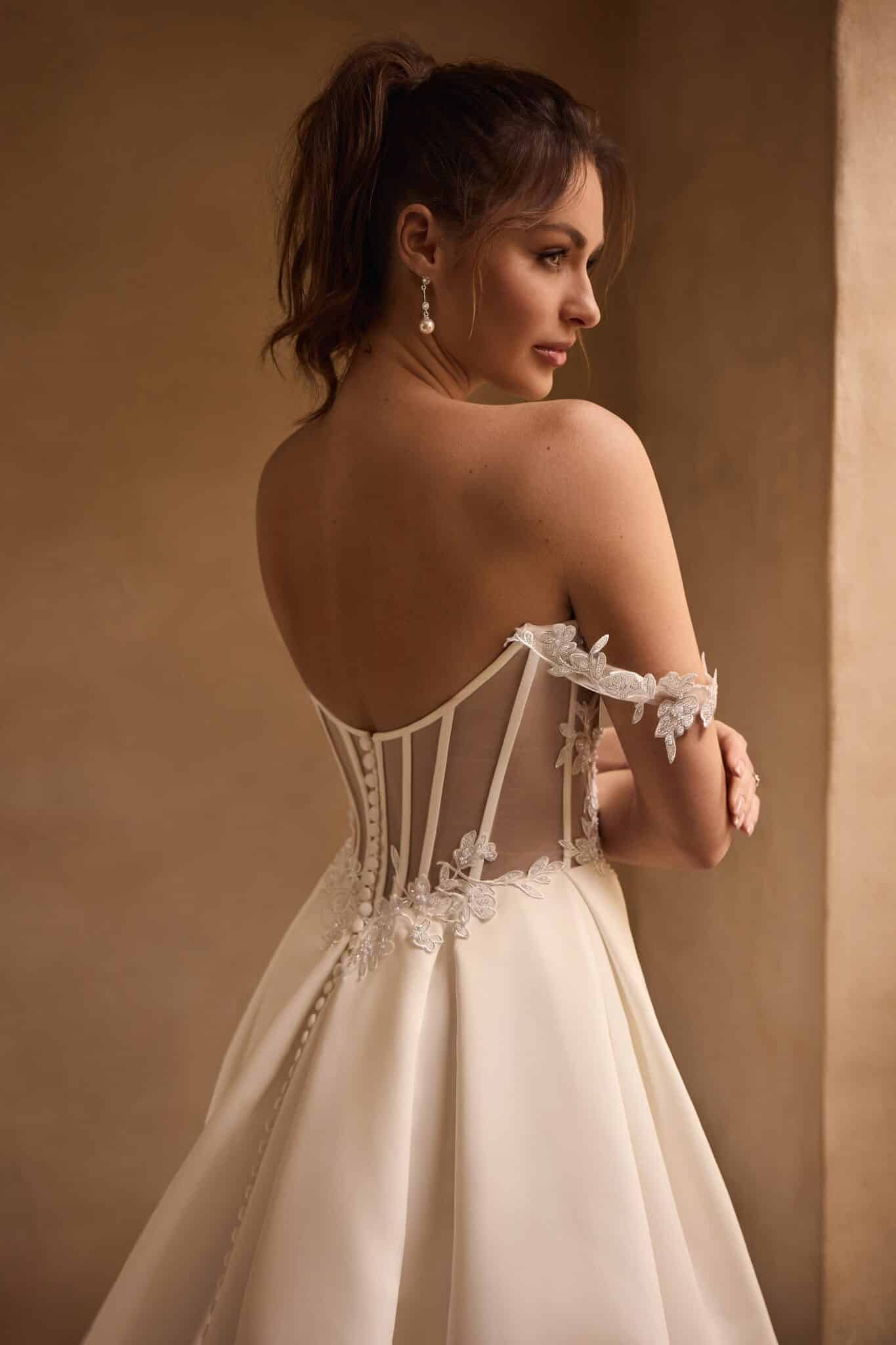 Make room for our captivating dove satin ballgown Rue; she is the definition of understated elegance. Rue's bodice is a unique masterpiece: featuring boning detailing, an illusion back, and floral beaded lace details thoughtfully placed to create a sweetheart neckline and lead the eye to Rue's off-shoulder lace straps. Her grand satin ballgown skirt features a leg slit for both a hint of sexiness and ease of movement. The back of this dress brings even more drama, with illusion boning and beautiful fabric-covered buttons that trail to the end of the train.