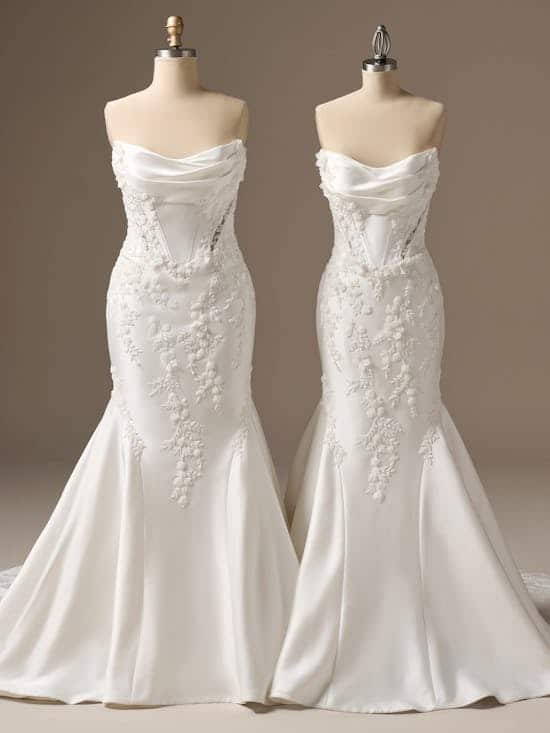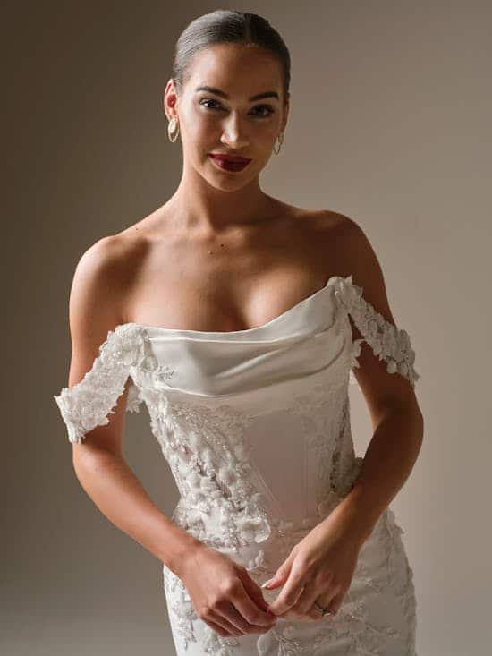 Say you're really romantic and have knockout style. It seems only this satin draped front bodice beaded 3D lace motifs fit-and-flare wedding dress (with fabulous accessories) will do.