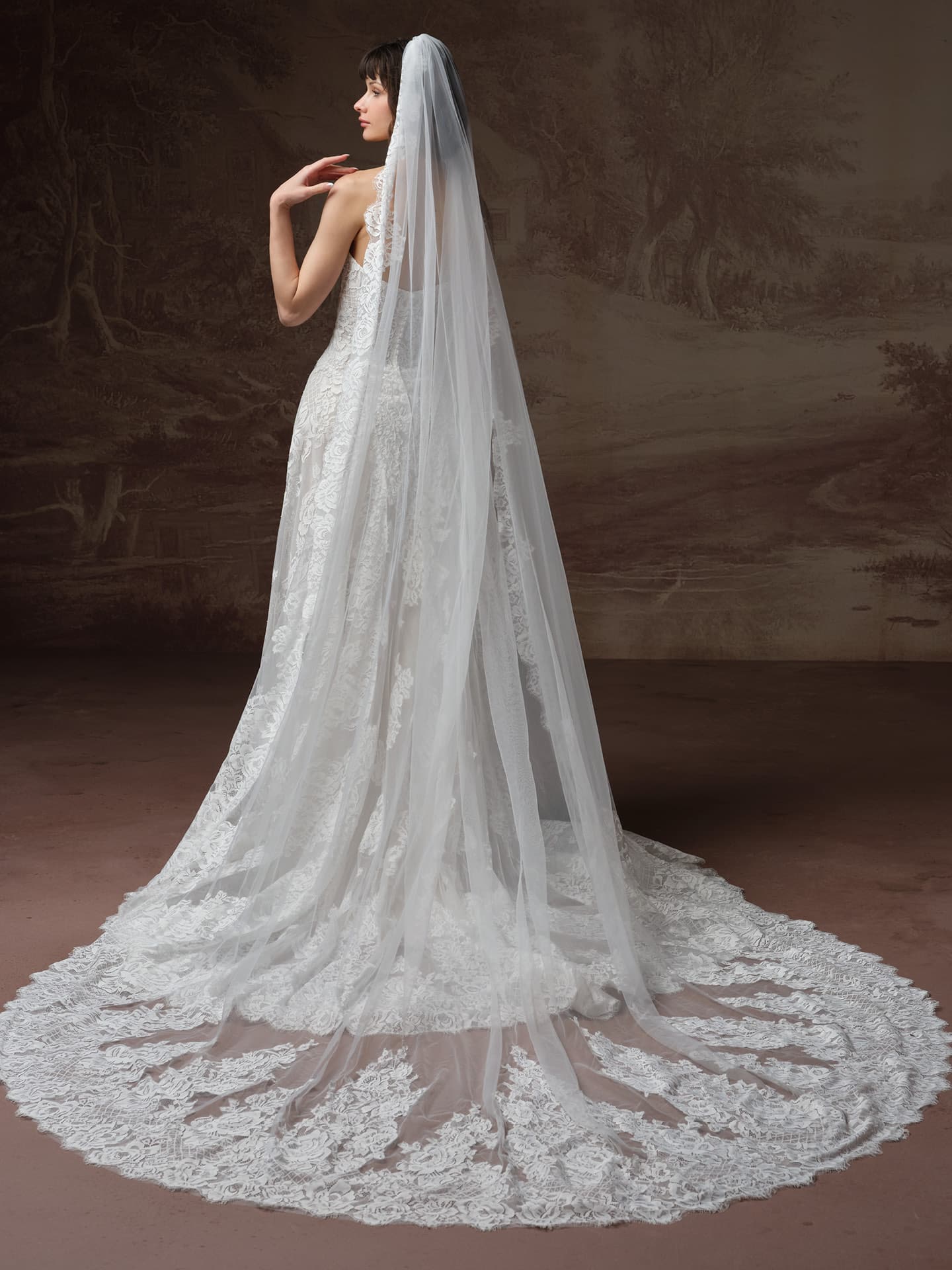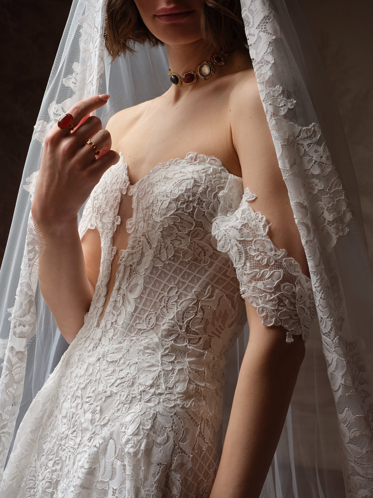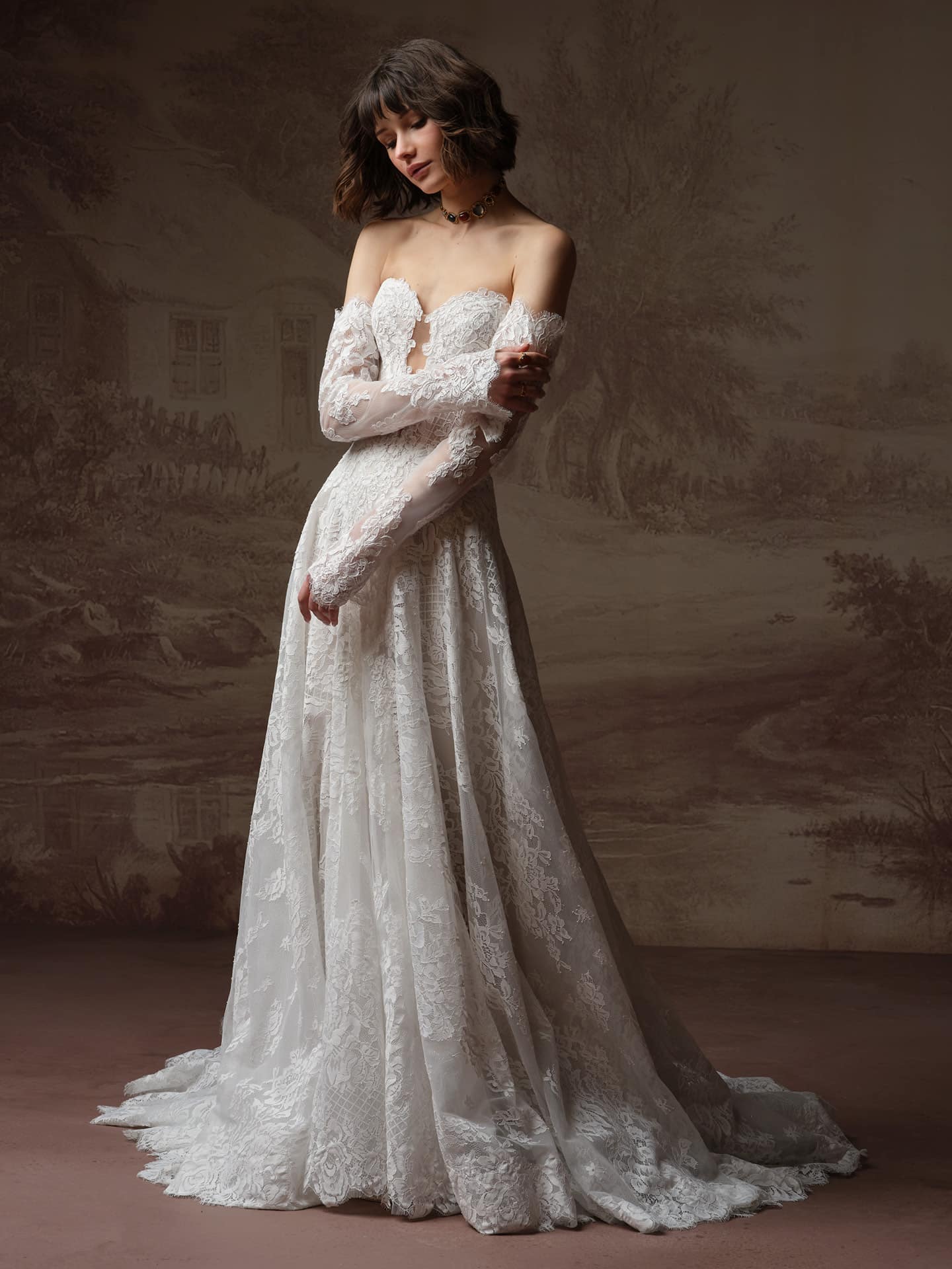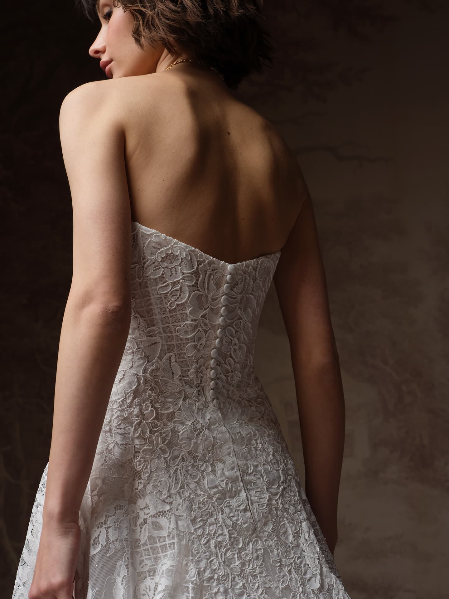 Keeva by Sottero & Midgley is a romantic lace gown crafted from crosshatch corded overlace, featuring a sheer illusion bodice and a strapless sweetheart neckline with a plunging illusion detail. Lined in luxurious Rosario crepe back satin, the silhouette is finished with covered buttons trailing down the back for a vintage-inspired touch. Customize your look with options for a fully lined bodice with an inner shapewear corset, plain tulle in place of glitter, or detachable off-the-shoulder illusion cap sleeves or long sleeves with flared cuffs for added drama.
