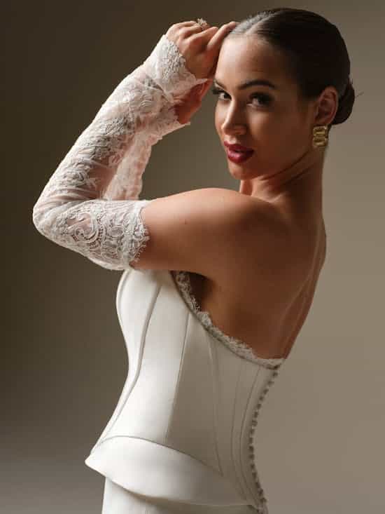 Give those curves the attention they deserve with this strapless Mikado wedding dress with corset bodice, cat eye neckline, and peplum hip details. It flatters, forms, and fits like a glove in all the right places.