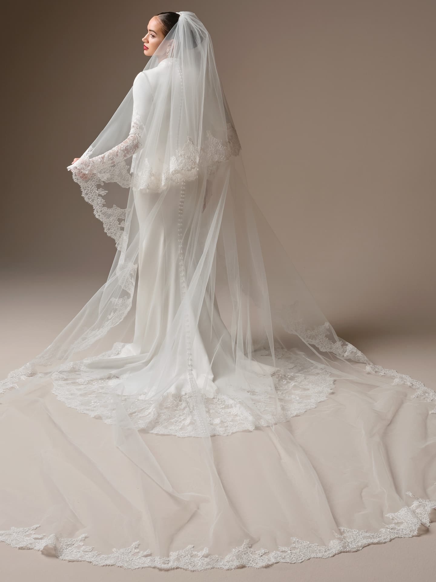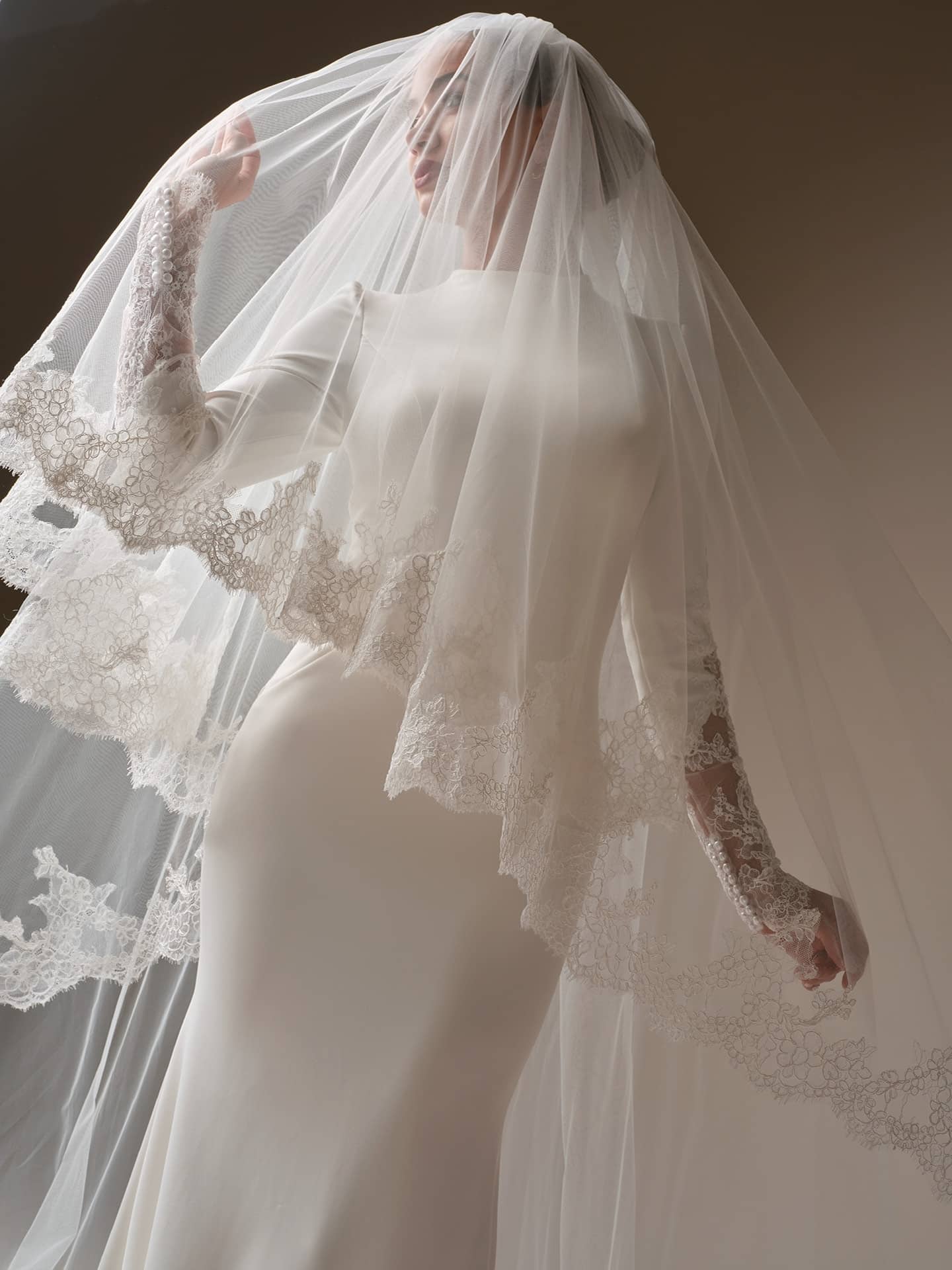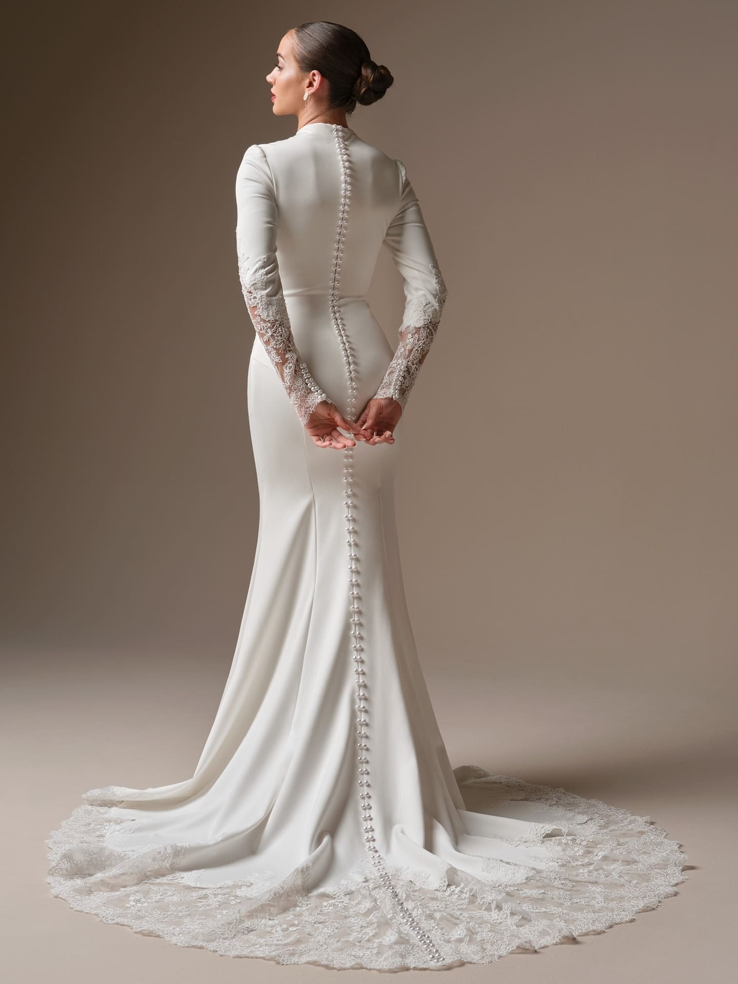 Minimalism is an excptional-magical-delight in this high neck Yama satian sheath wedding Dress with Illusion lace sleeves and extended lace train.