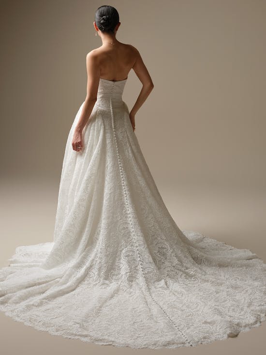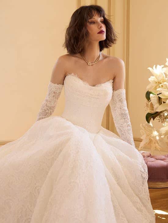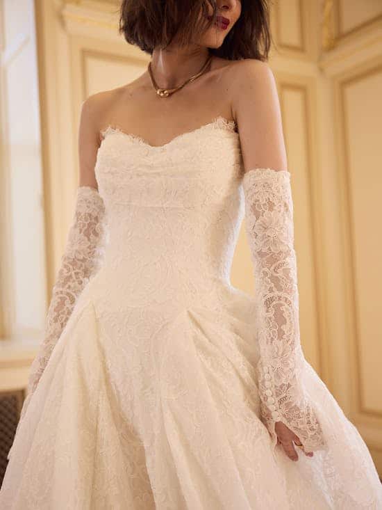 To level up in all things ethereal and nature-inspired, consider this unembellished lace A-line wedding dress with sweetheart neckline, draped bodice, and pockets and all its heavenly accessory potential.