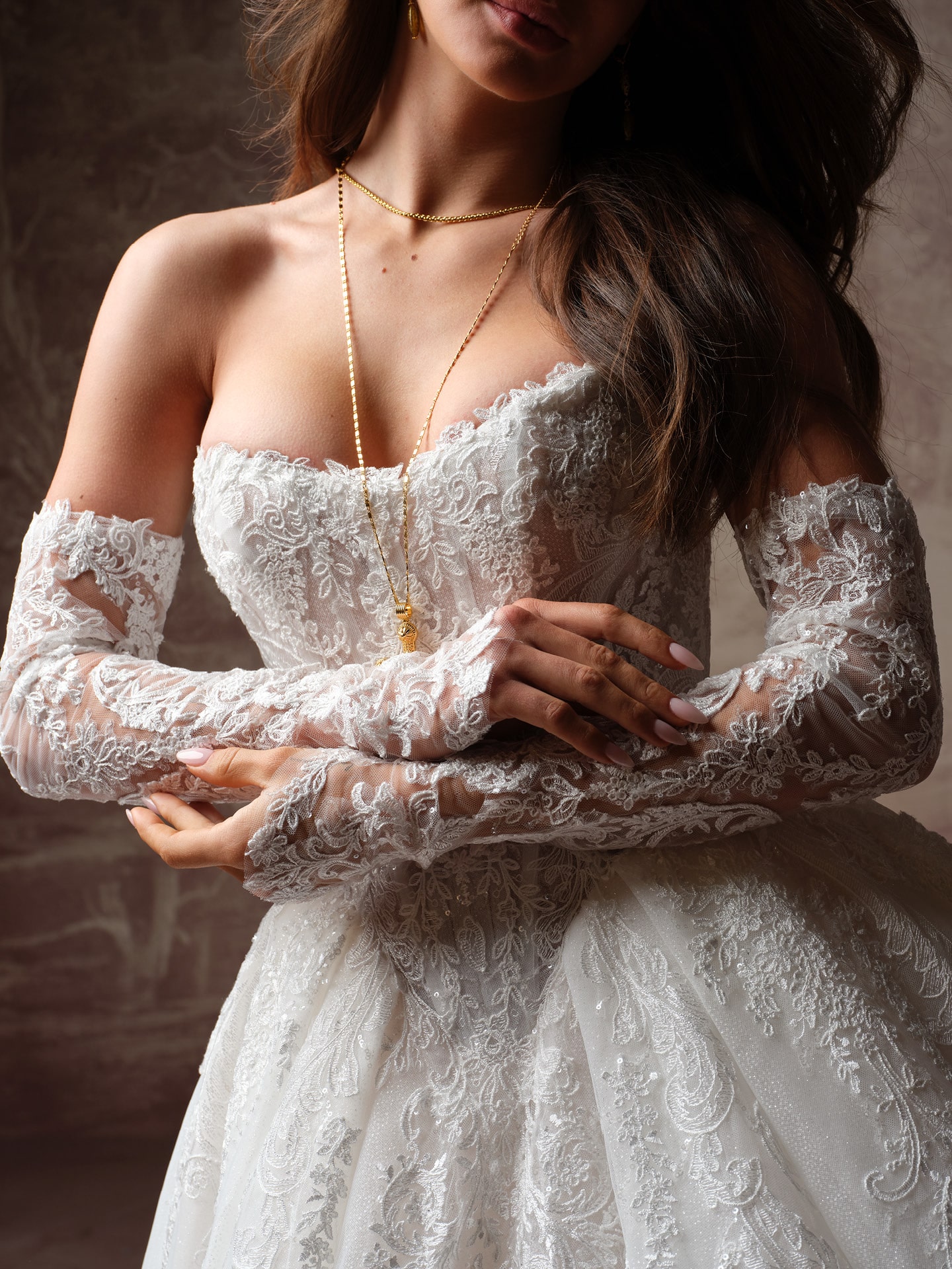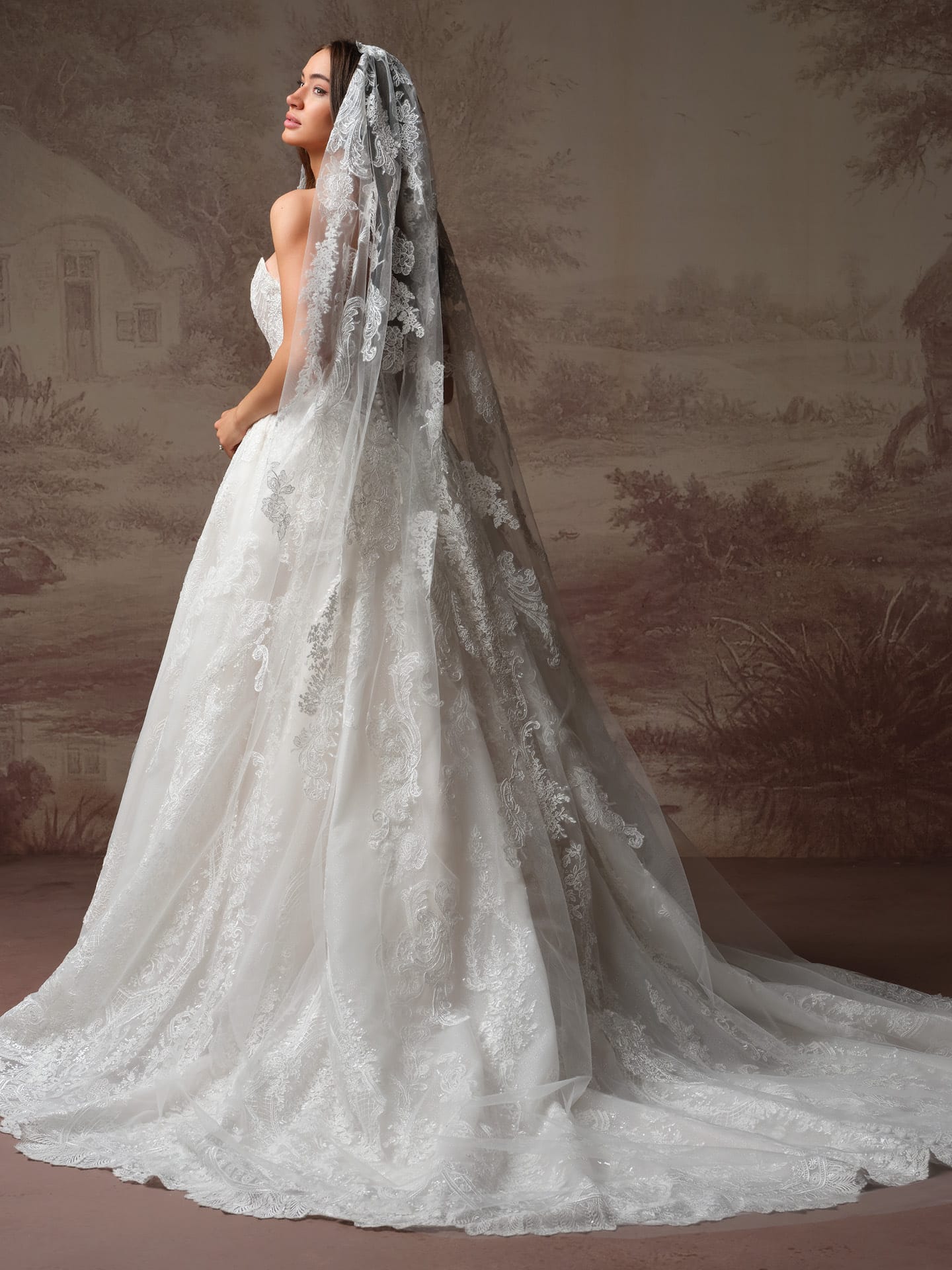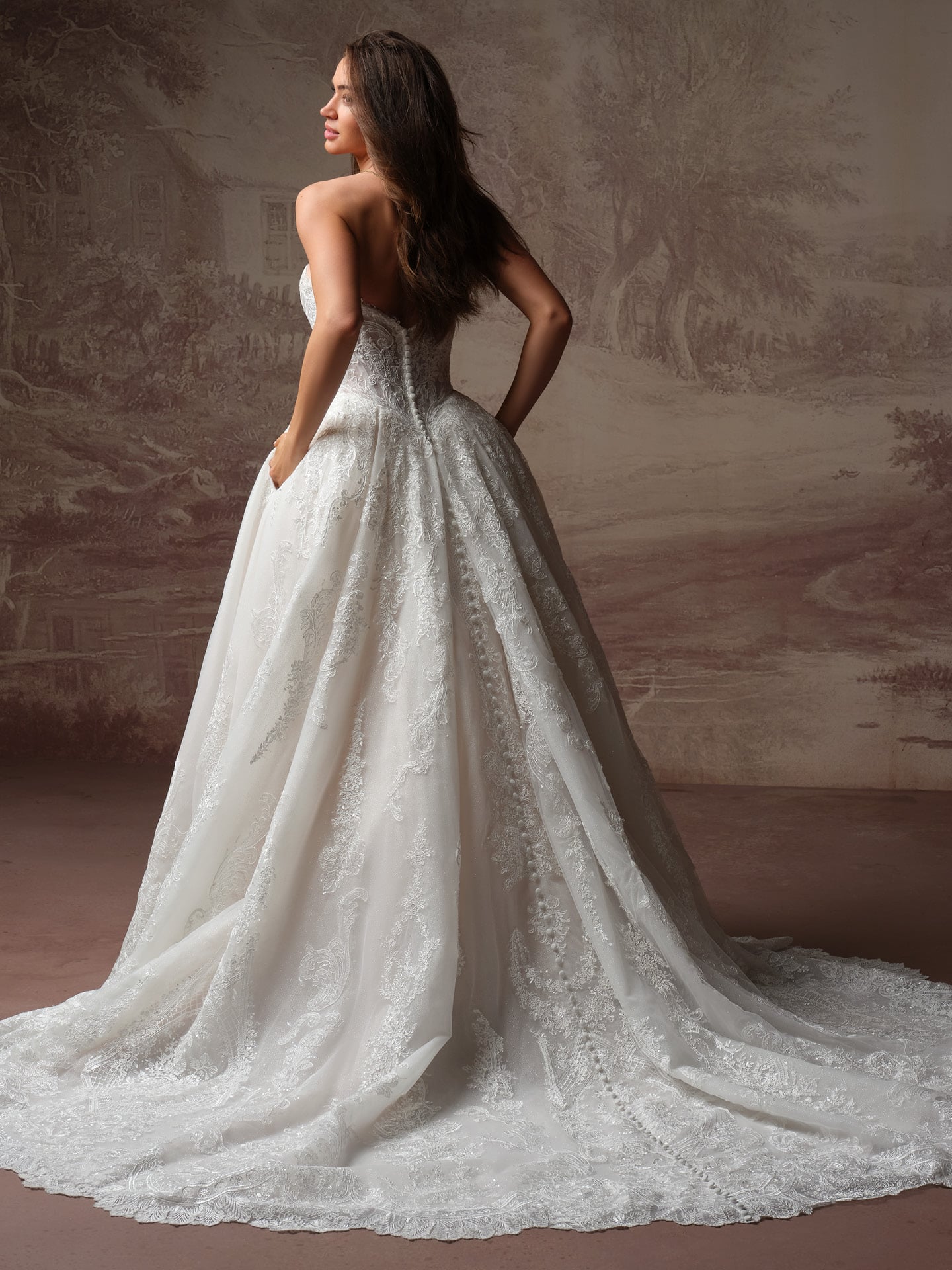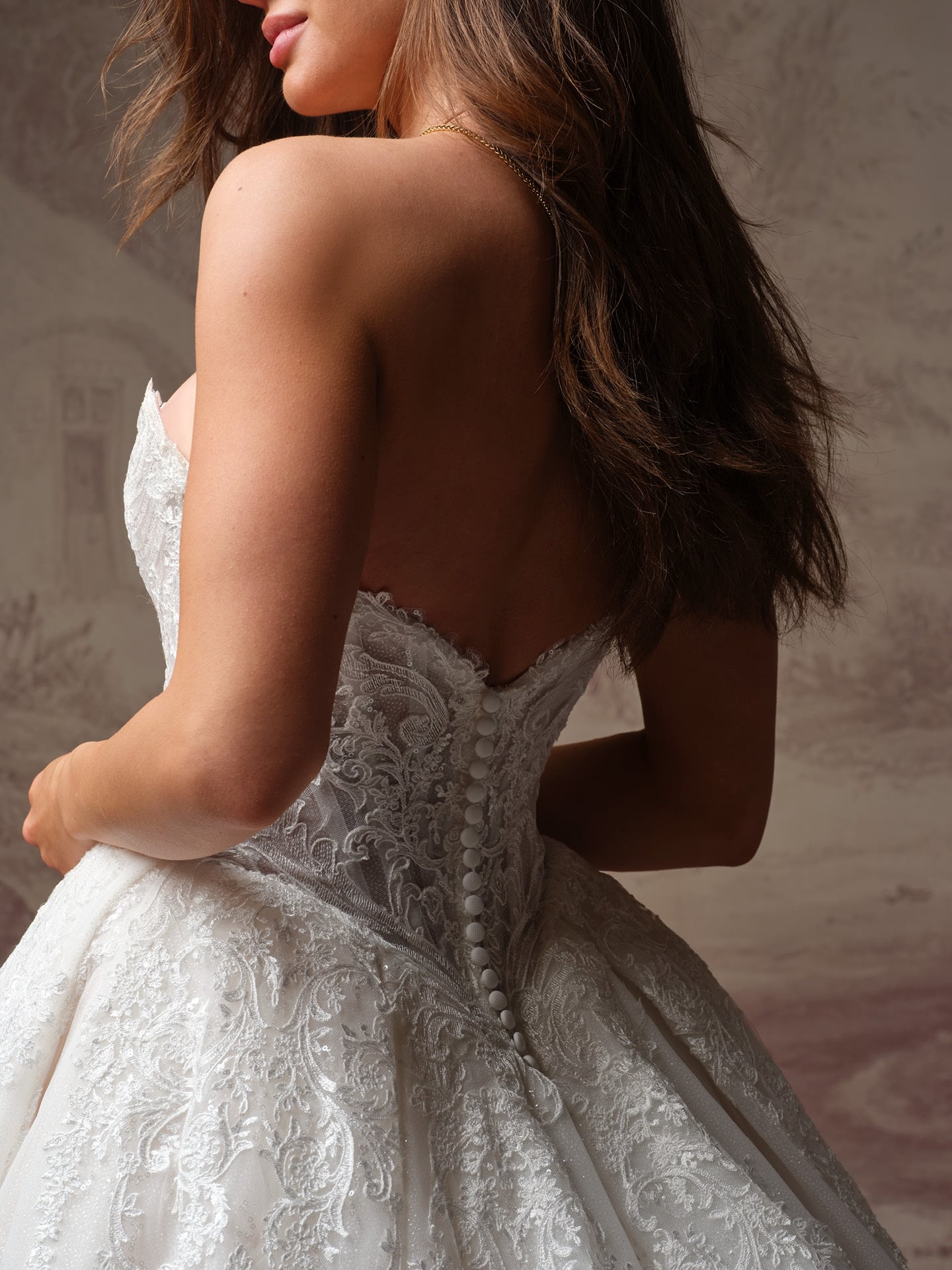 Yesenia by Sottero & Midgley is a radiant lace gown featuring sequined motifs over glitter tulle for a soft, luminous effect. The sheer illusion bodice with a sculpted basque waist is complemented by a cat-eye neckline and a romantic sweetheart back. Finished with pockets, a Kahili recycled lining, and covered buttons trailing to the hem, Yesenia blends modern detail with timeless elegance. Complete the look with optional detachable off-the-shoulder sleeves or a cathedral-length veil adorned with matching sequined motifs.