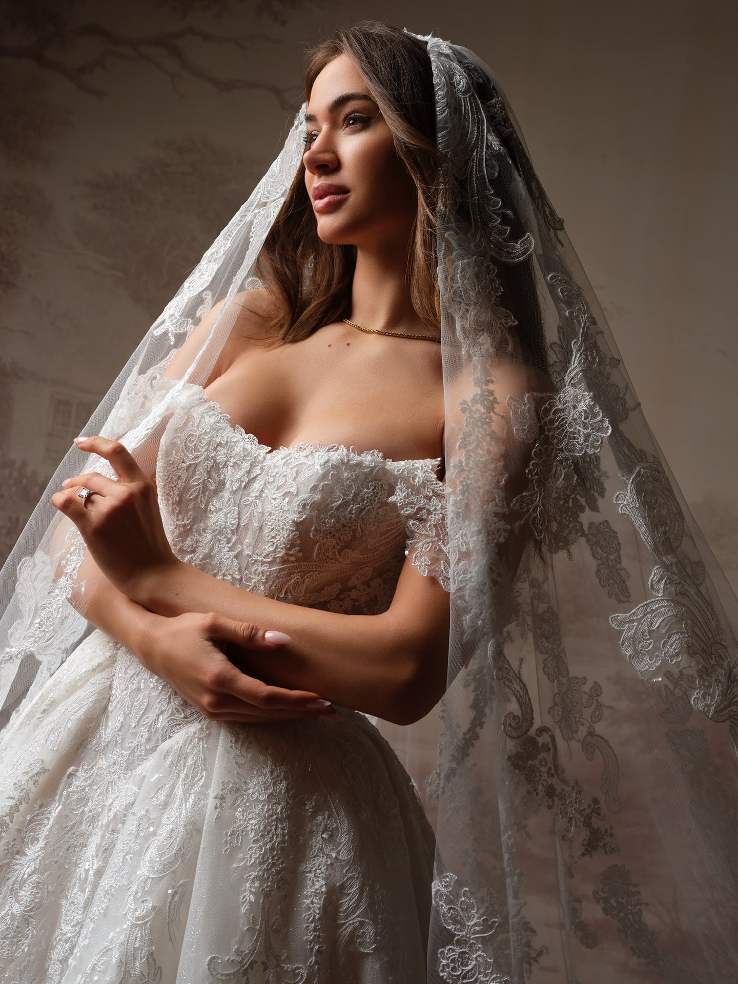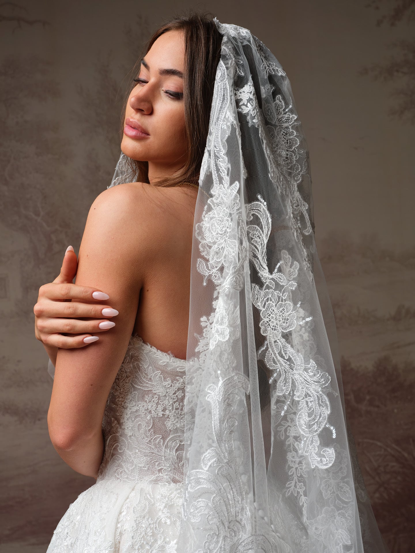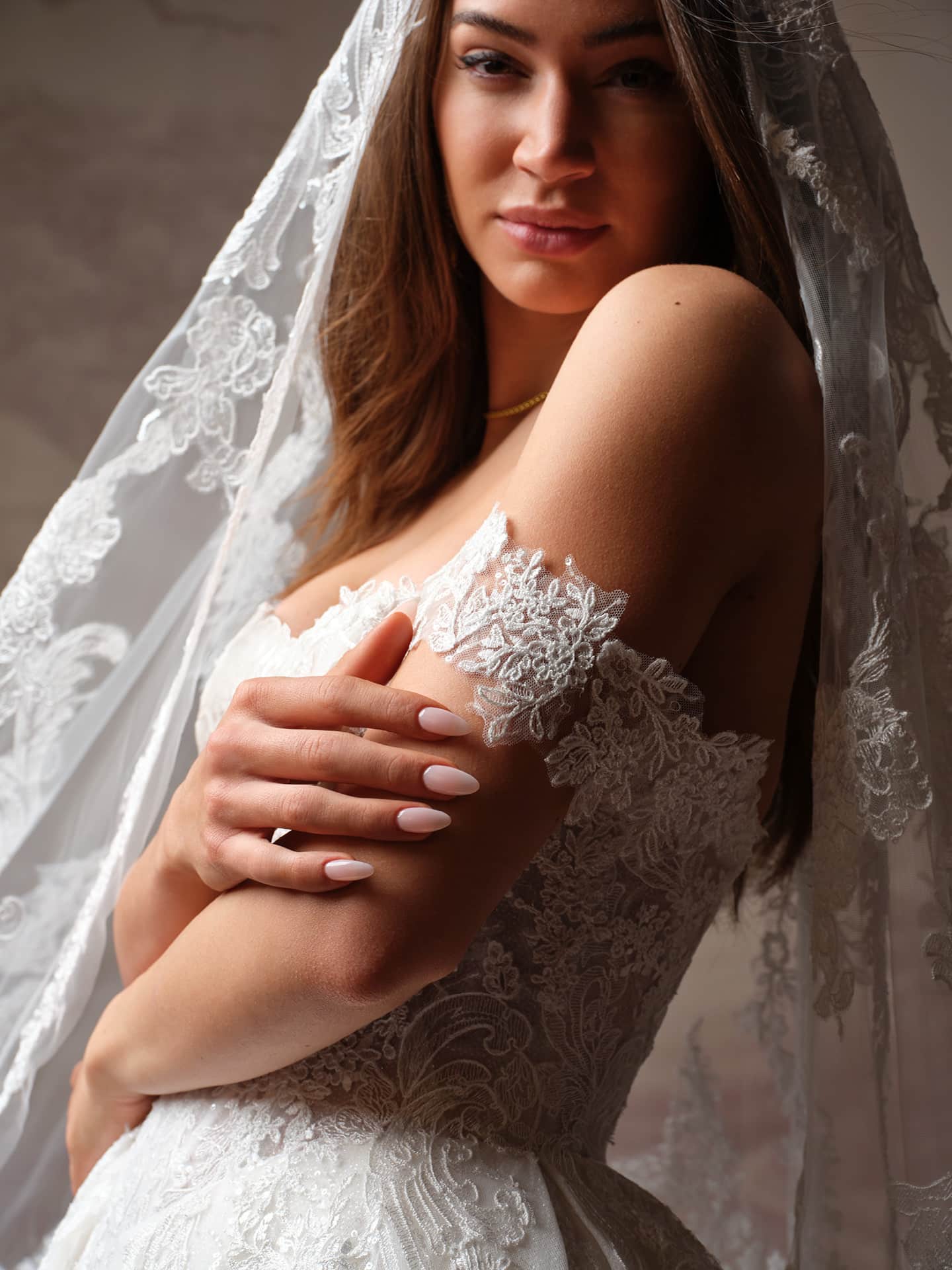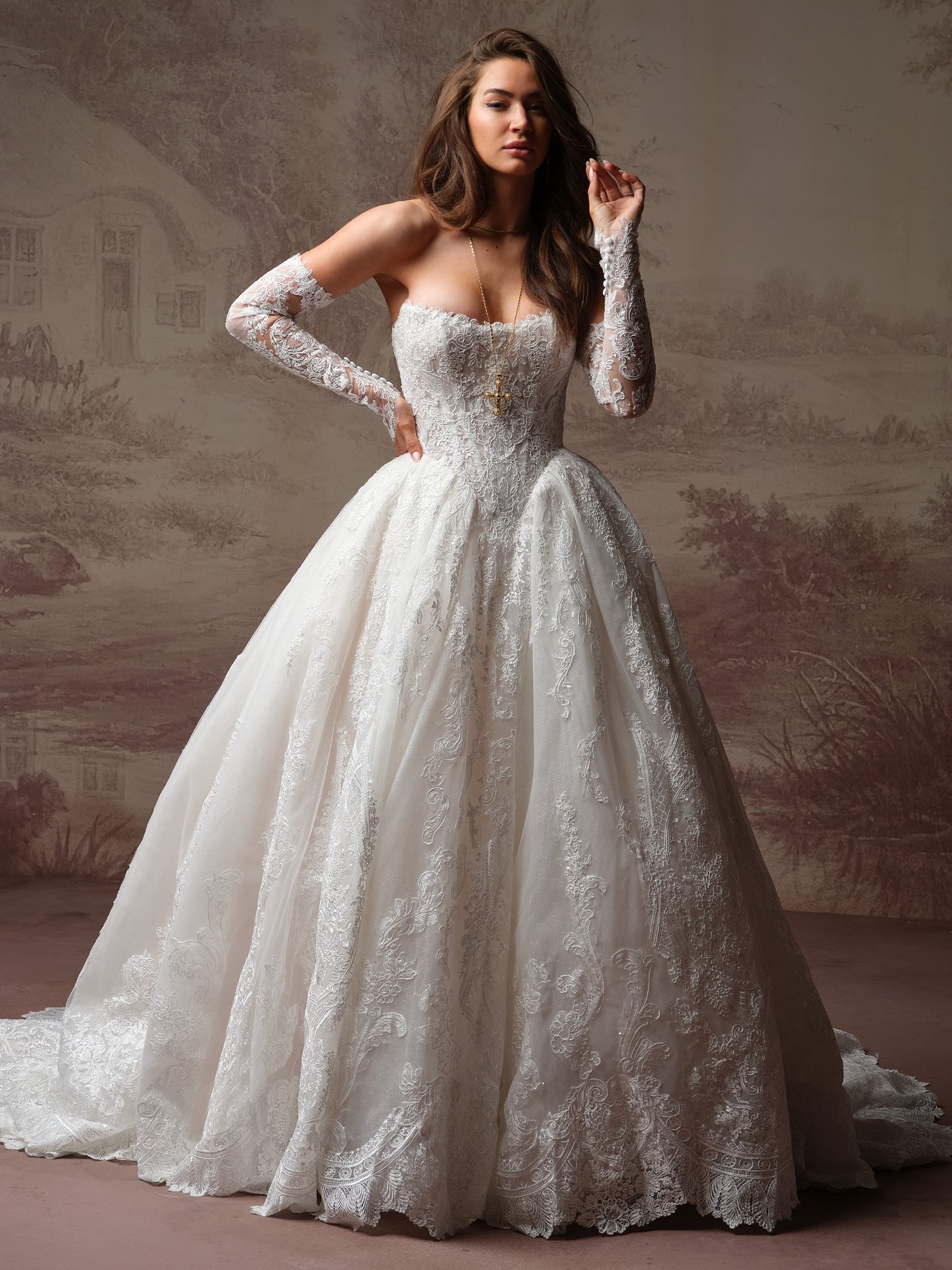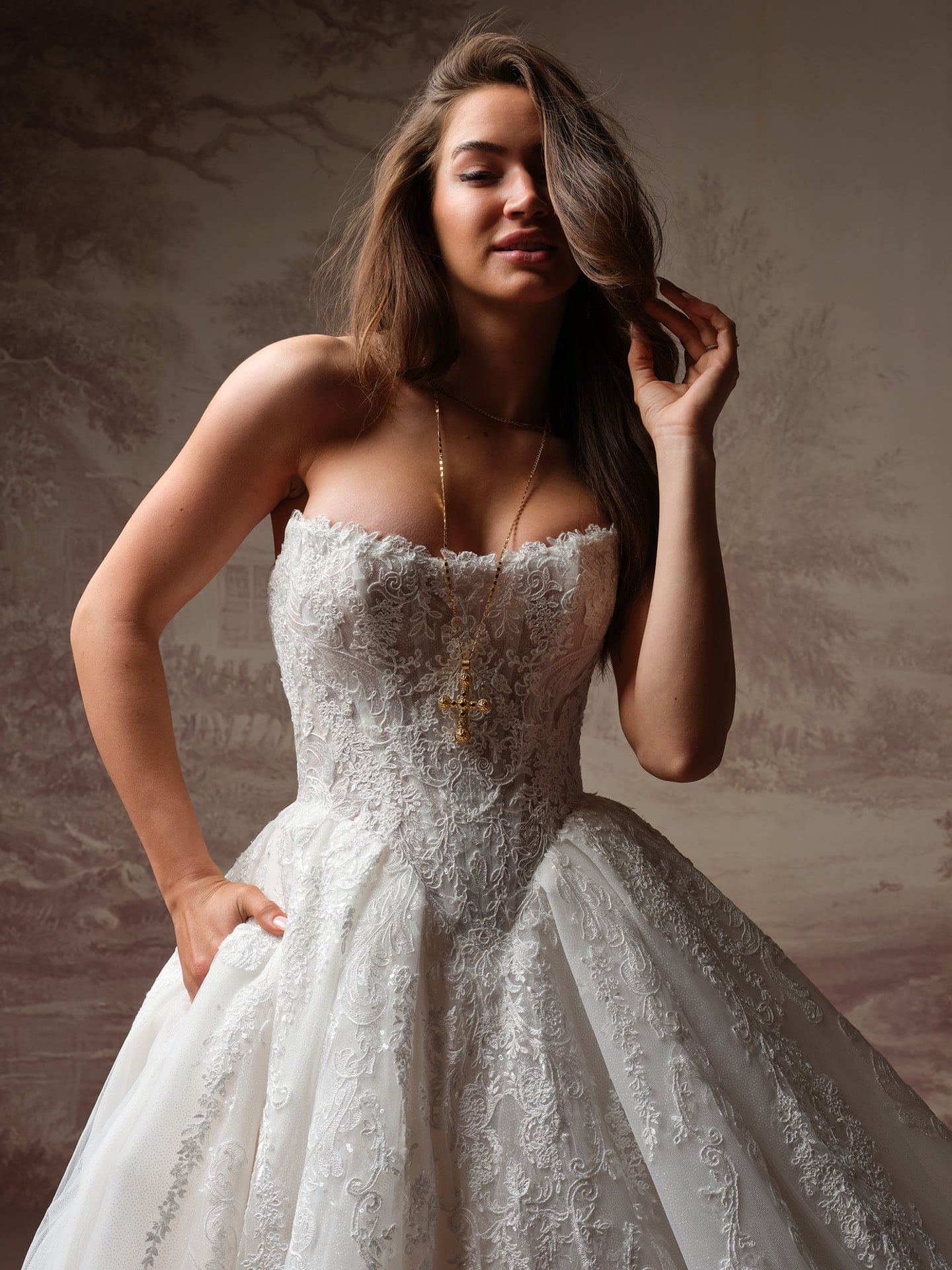 Yesenia by Sottero & Midgley is a radiant lace gown featuring sequined motifs over glitter tulle for a soft, luminous effect. The sheer illusion bodice with a sculpted basque waist is complemented by a cat-eye neckline and a romantic sweetheart back. Finished with pockets, a Kahili recycled lining, and covered buttons trailing to the hem, Yesenia blends modern detail with timeless elegance. Complete the look with optional detachable off-the-shoulder sleeves or a cathedral-length veil adorned with matching sequined motifs.