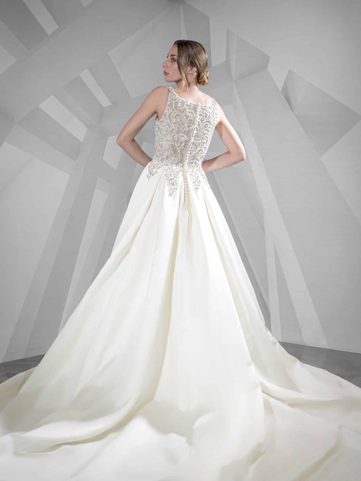 Satin ballgwn heavy jeweled vnk illusn bod.plain box pleat satin full skirt/button bk