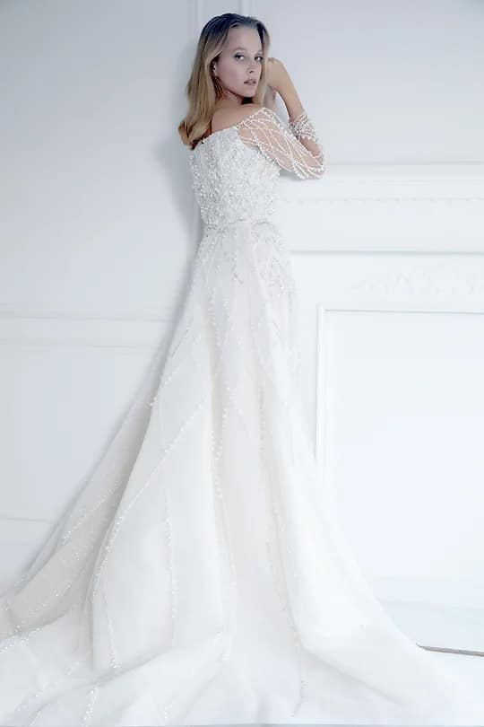 Dress & Overskt/Off shldr.lg illusn slvs/fully beaded fit n flr gwn w/side slit & plunge NL