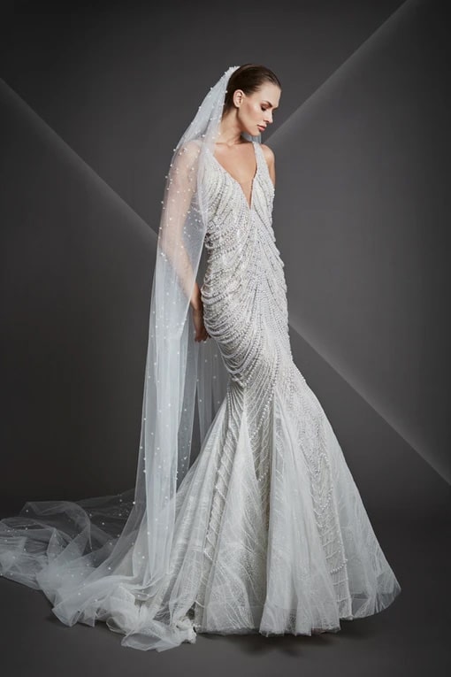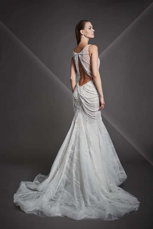 Sleeveless Plunging V-Nkl,Open Low Back Fit-N-Flair Covered In Pearls In A Chandelier Drape Strands Of Pearls And Crystals Drape In A Large Swags, cracked glitter tulle lauer underneath , sweep train