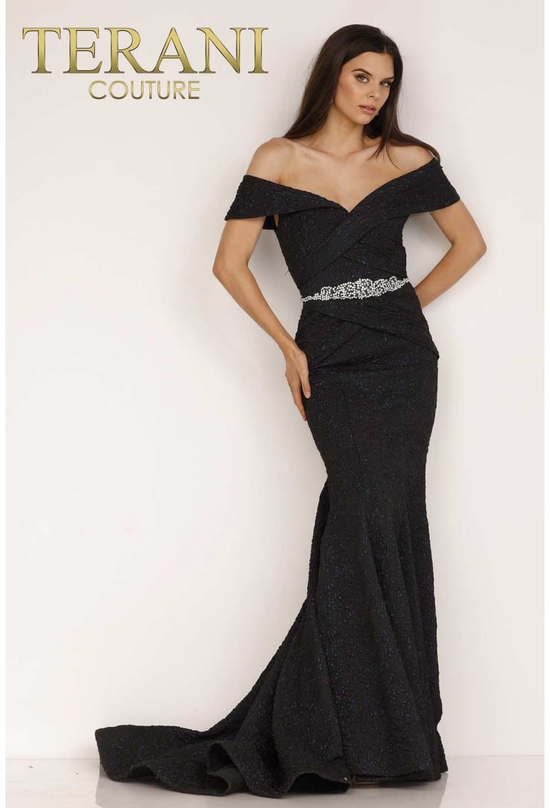 Mermaid silhouette to its off-the-shoulder bodice with crisp, eye-catching pleats, it is a winner. A sparkling belt cinches at the natural waist, and the skirt flares out in long folds of delicately embellished material.