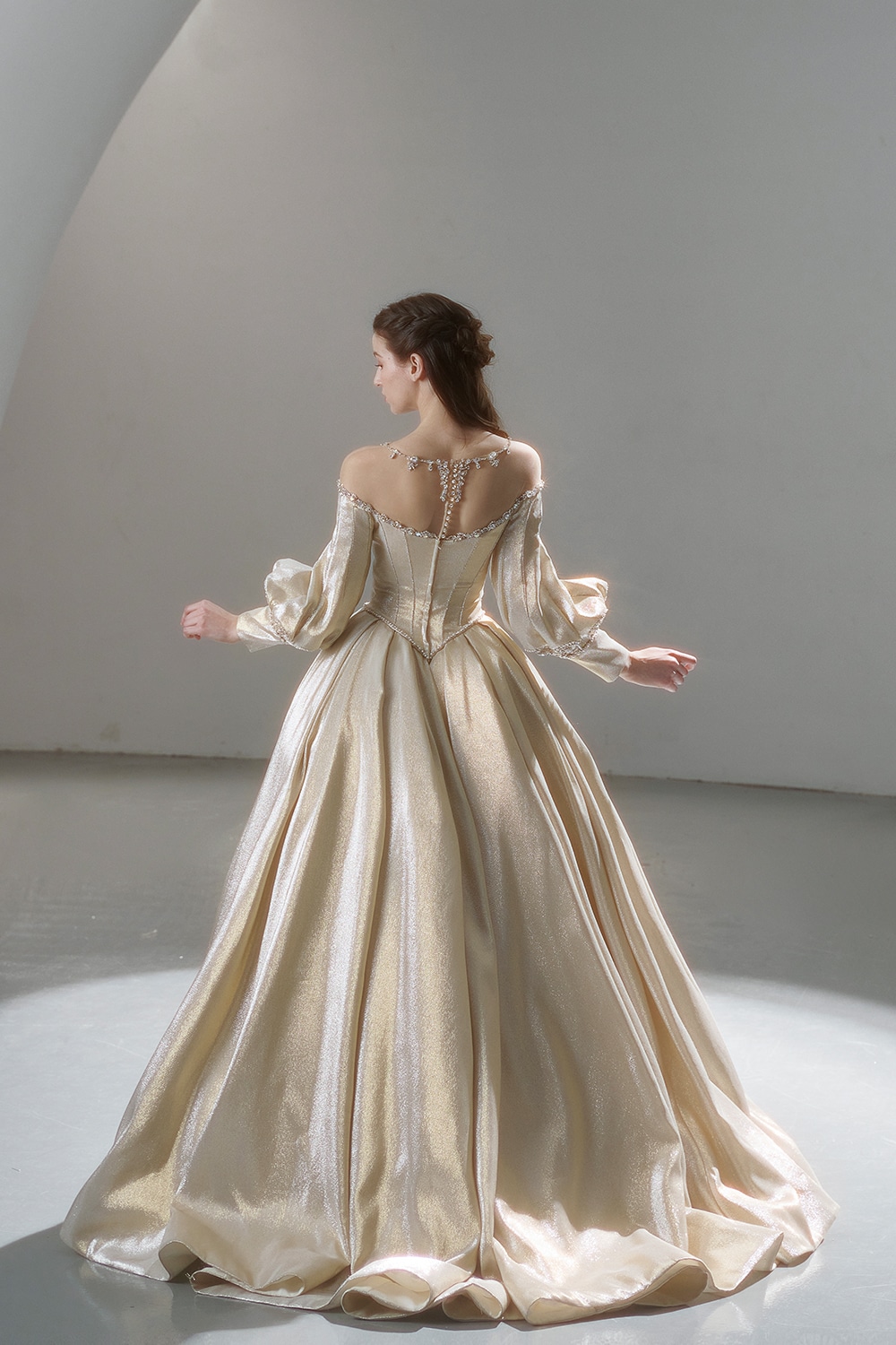 What does it look like to have gilt stars dotting the night sky? A starship called "Star Gilt" was launched and came across the sky. It is a unique interstellar exploration ship where the hull is inlaid with countless shining gilt gems, shining in the darkness, just like a bright star. If we were to anthropomorphize the starship, what kind of imagery would the persevering Avivia give us? The beaded embroidery and hand-stitched diamonds sheep leg sleeves ball gown should be one of the designs. The invisible jewelled neckline allows Avivia to graciously reveal her beautiful collarbone, and the corset bodice is inspired by the gilt gems embellished on a starship. The V-shaped design on the waist that created through beading and hand-stitched diamonds perfectly combined with the pleats on the skirt, while the layering of the texture that formed the pleats supported the entire silhouette of the skirt, exuding radiance, and vitality as if it were a spaceship flying overhead.