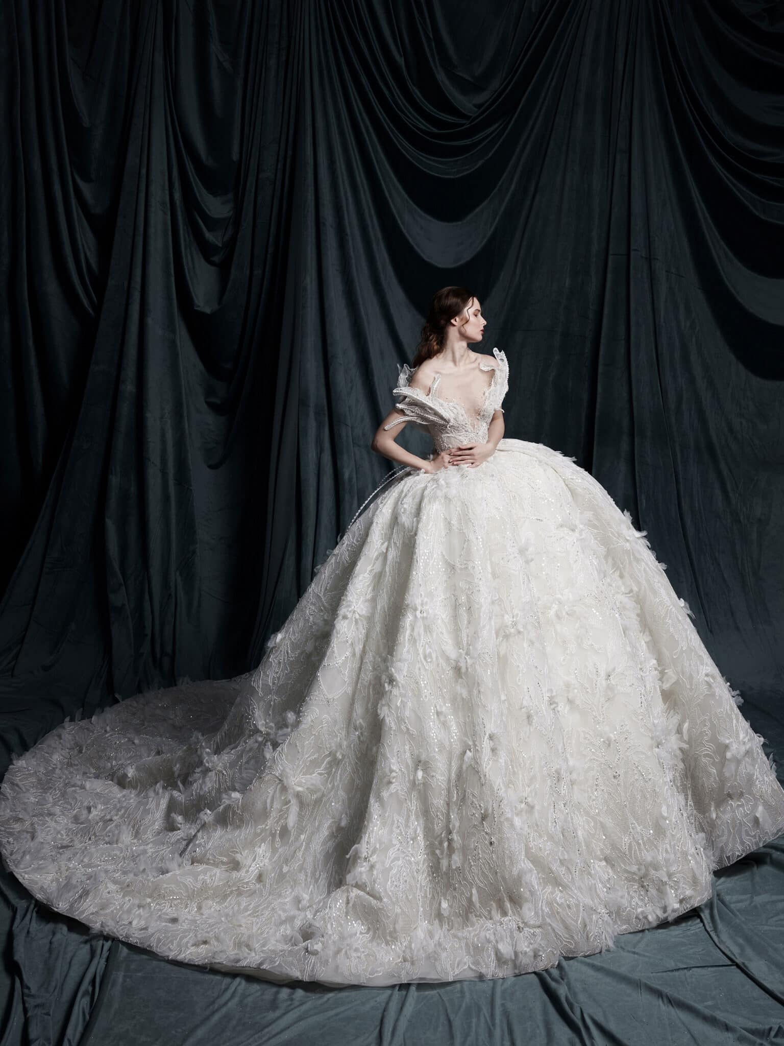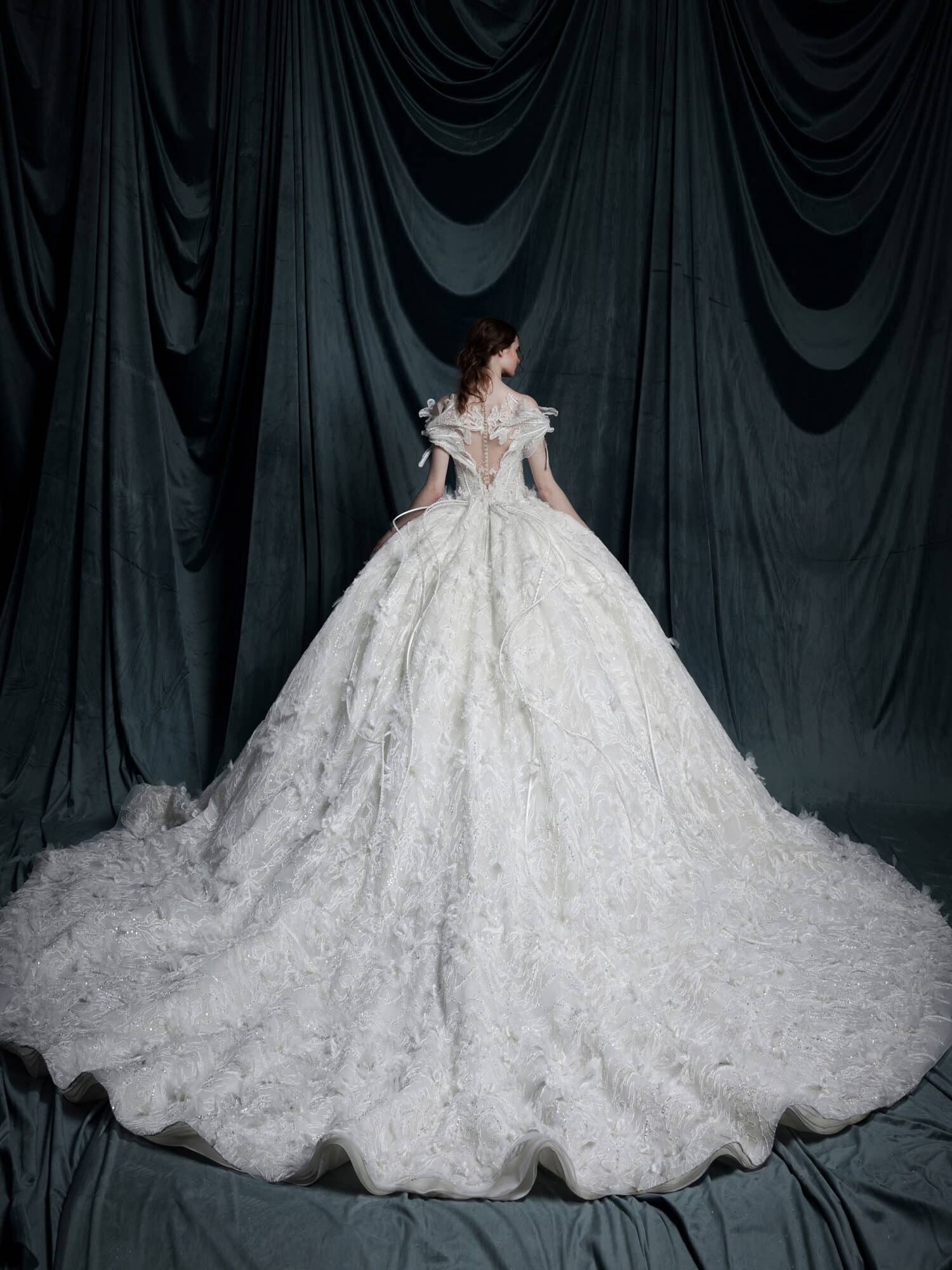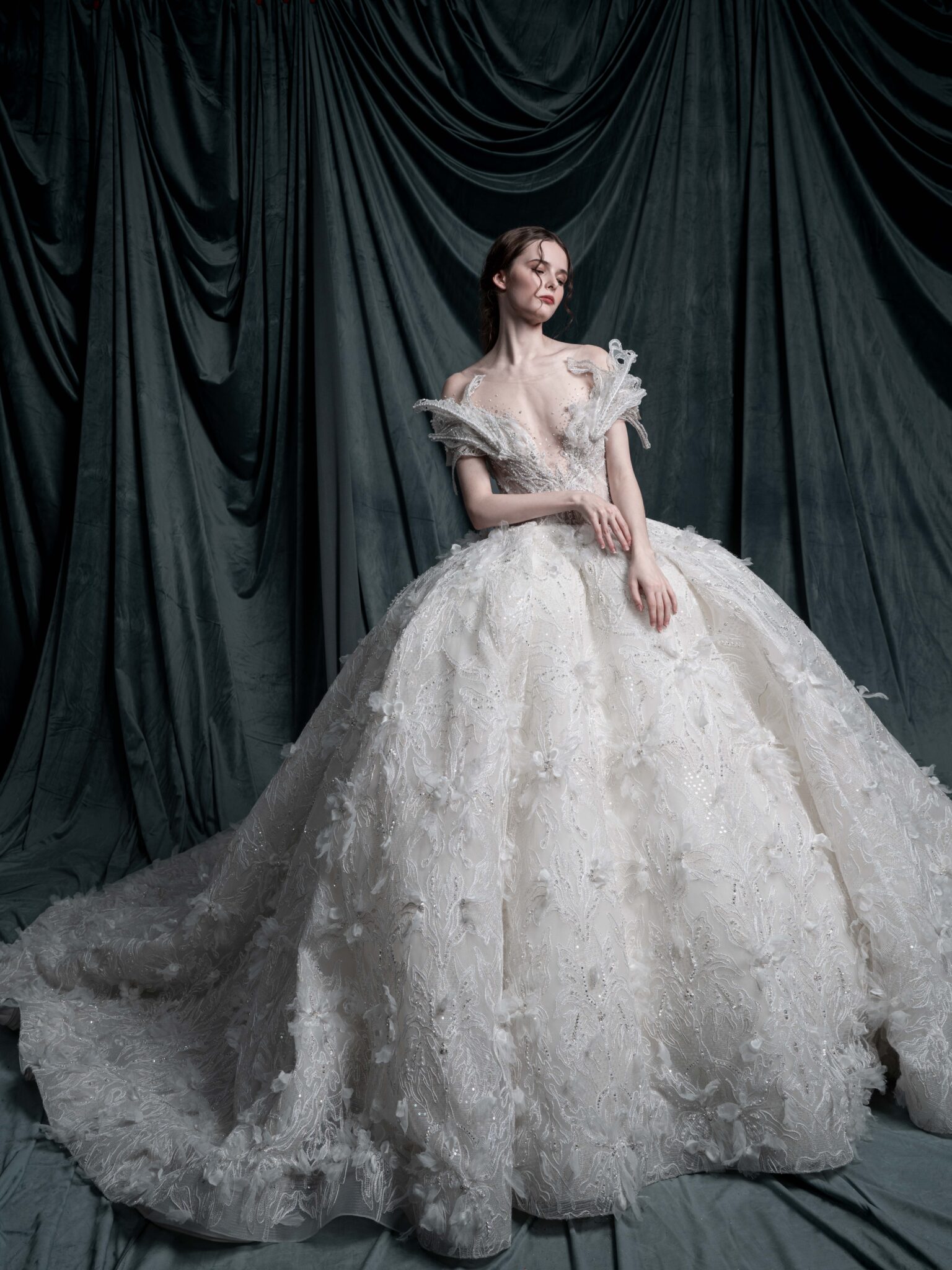 This voluminous wedding gown is like a nymphwho coming from the forest. The semi-transparent topper consists of sculptural off-the-shoulder that made of 3D lace flowers with a illusion round neck spreading to the back. Fitted with waterfall skirt full of enchanting lace and appliques exuding a lush touch.