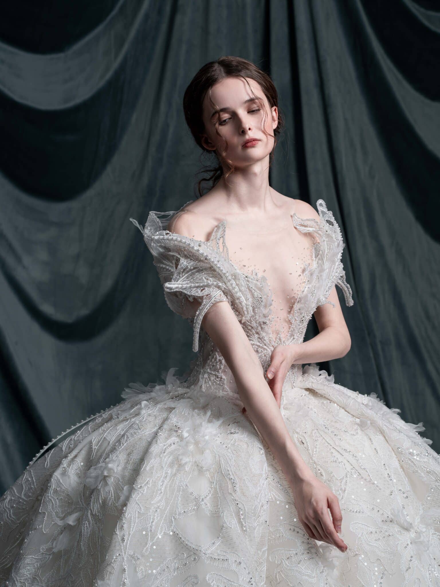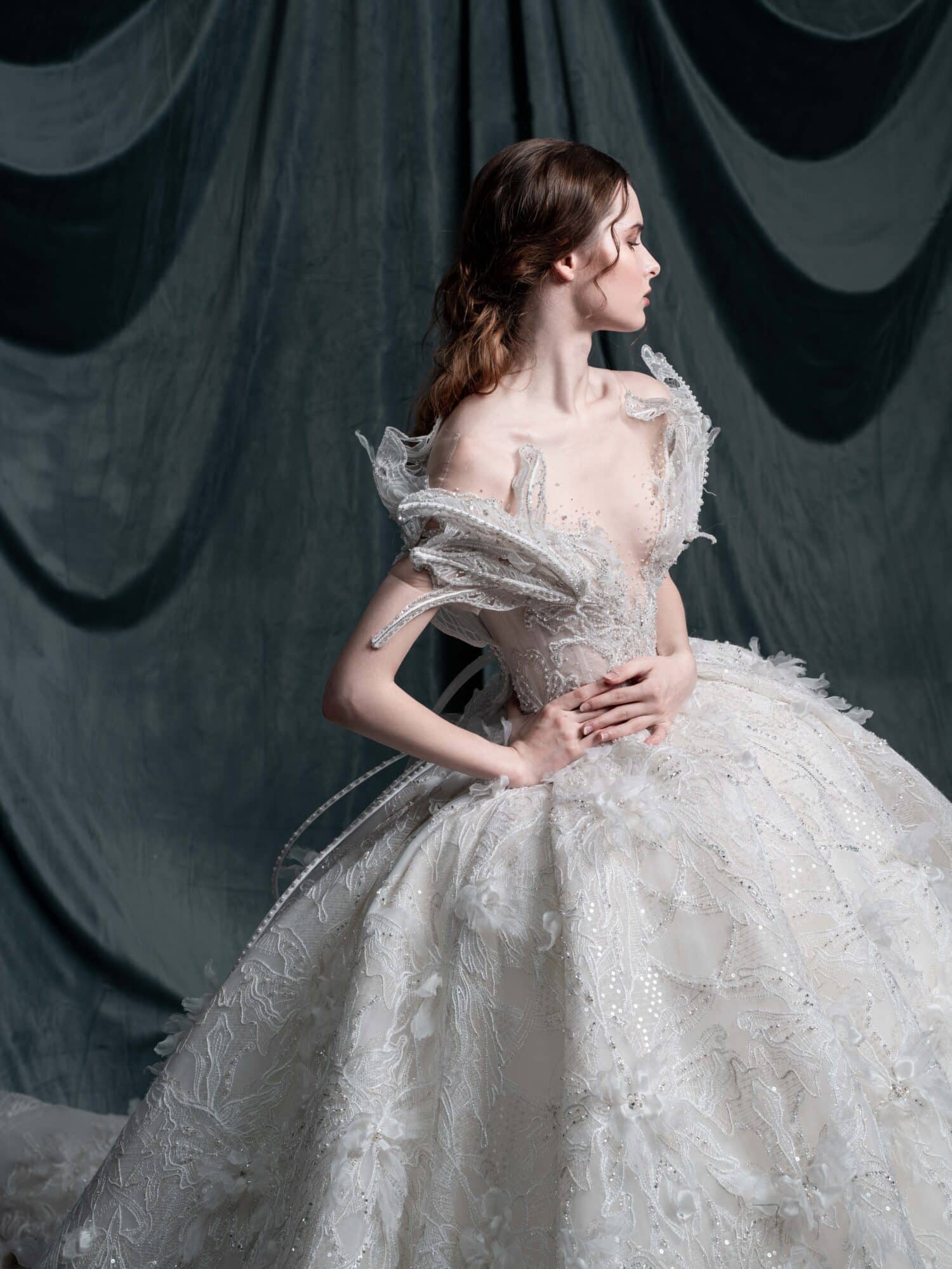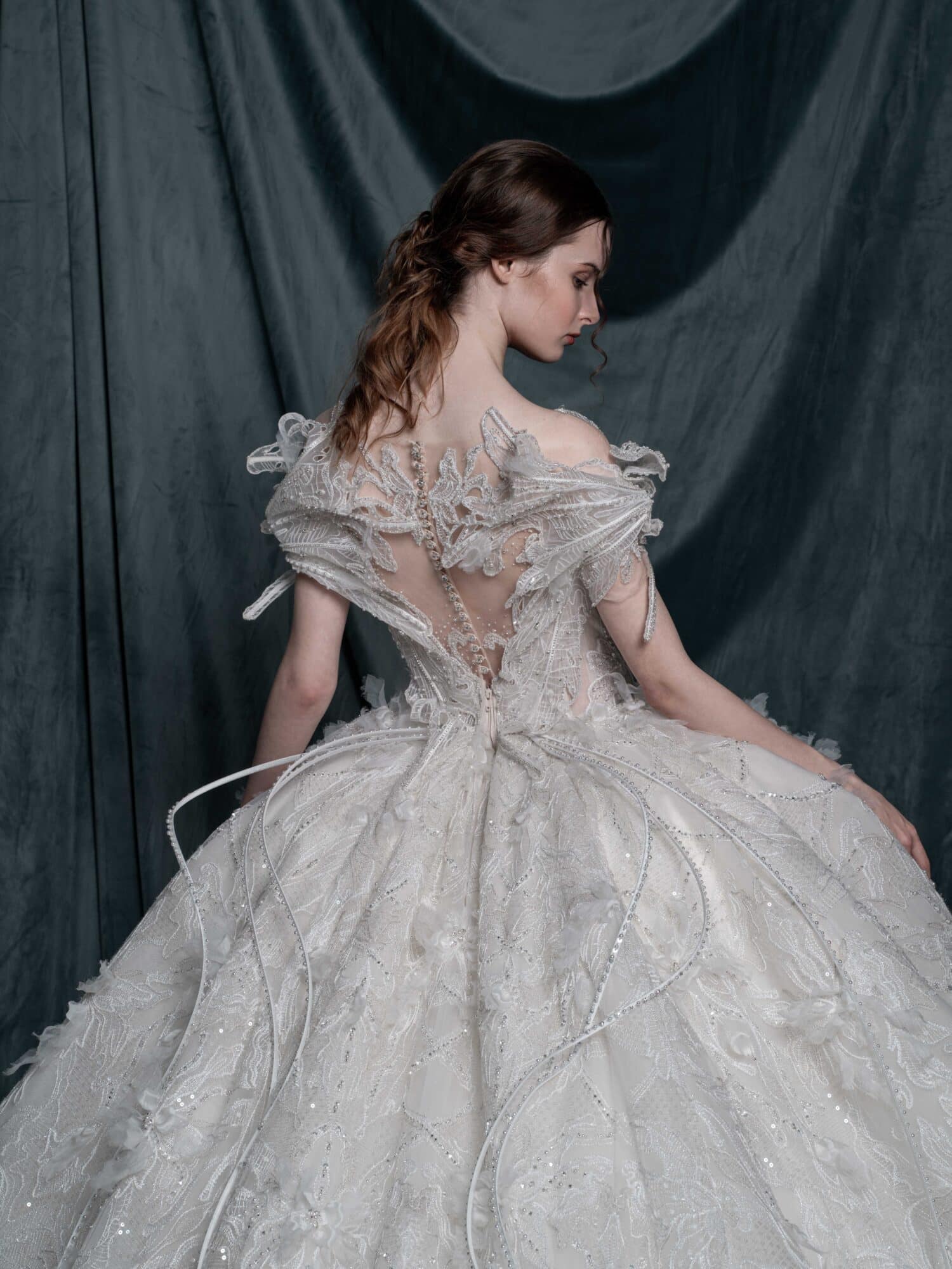 This voluminous wedding gown is like a nymphwho coming from the forest. The semi-transparent topper consists of sculptural off-the-shoulder that made of 3D lace flowers with a illusion round neck spreading to the back. Fitted with waterfall skirt full of enchanting lace and appliques exuding a lush touch.