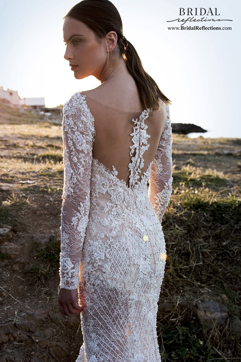 This wedding gown features a captivating illusion plunging V-neckline adorned with delicate beaded lace, creating a mesmerizing and romantic allure. The intricate detailing on the illusion fabric adds a touch of sophistication, making this gown a stunning choice for brides seeking a combination of modern elegance and timeless charm.