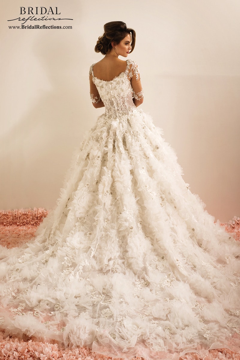 This wedding gown showcases nude illusion sleeves and a sweetheart neckline crafted from delicate and intricate beadwork. The subtle yet stunning design creates a romantic and enchanting look, adding a touch of modern sophistication to the bride's overall elegance.