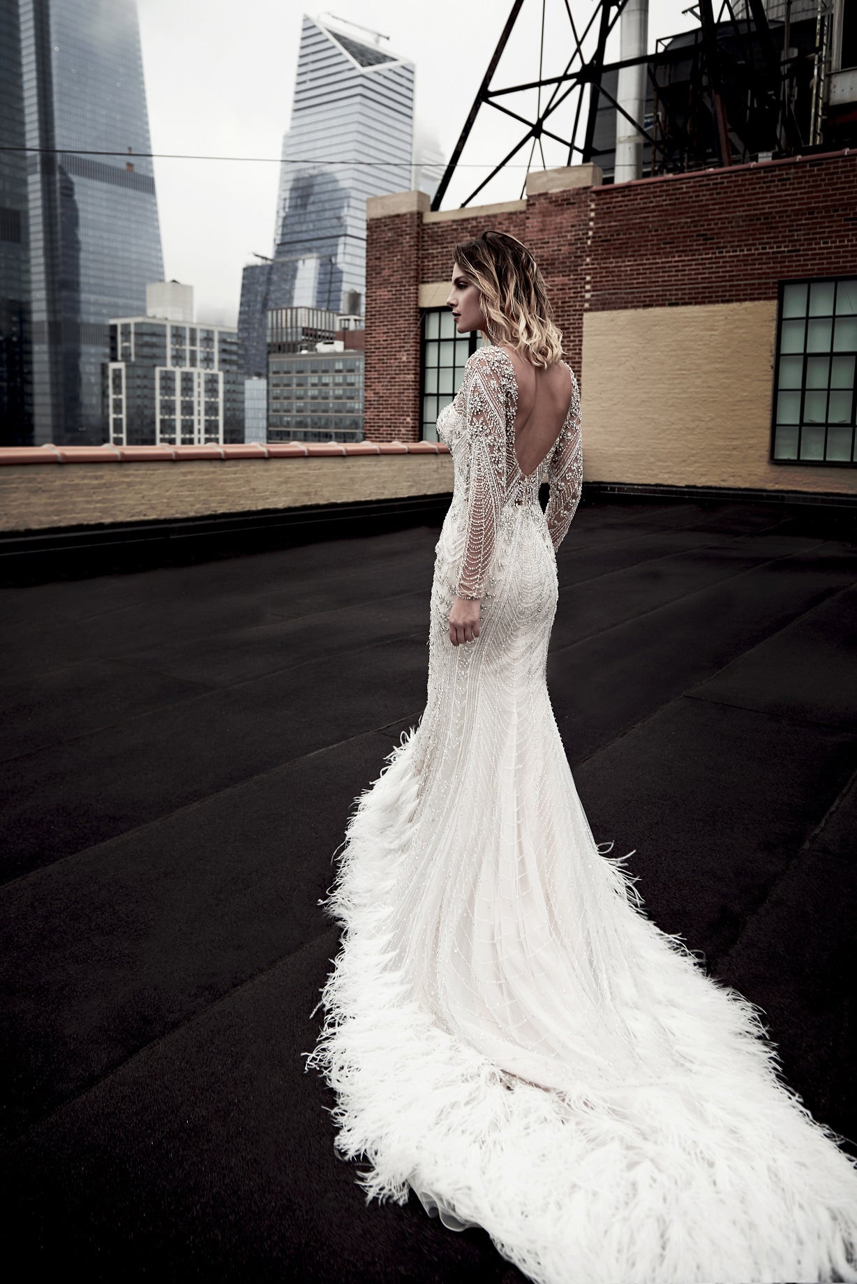 This elegant wedding gown features a fitted silhouette with long beaded illusion sleeves, creating a timeless and sophisticated look. The low V-back adds a touch of allure, while feathers at the bottom of the skirt bring a whimsical and modern element to this enchanting bridal ensemble.