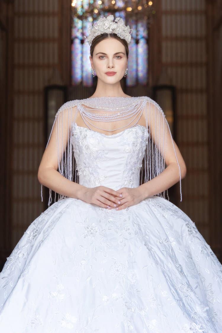 This stunning Ysa Makino gown, style number 781059, is a regal ballgown featuring exquisite floral embroidery on luxurious fabric. The dress boasts a structured bodice with a sweetheart neckline, adorned with cascading pearl and crystal embellishments that drape elegantly over the shoulders. The voluminous skirt flows gracefully, creating a fairytale silhouette.