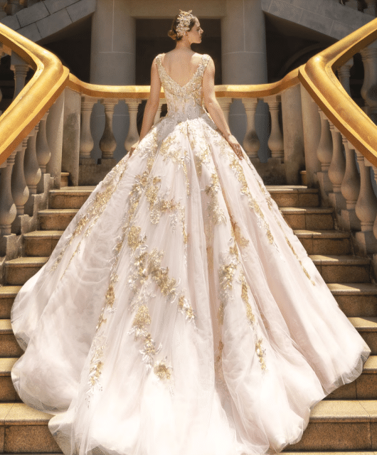 Style 781060 from the Ysa Makino Evening Wear Collection is the definition of regal elegance. Shown here in a soft blush with gold, our version arrives in a classic and ethereal off white on off white, offering a more timeless, romantic interpretation. This breathtaking ball gown features a V-neckline with illusion straps and a structured, corset-inspired bodice that flows seamlessly into an extravagant full skirt. Delicate three-dimensional embroidery and glistening beadwork cascade throughout the gown, creating a shimmering, vine-like effect that adds depth and artistry to every angle. With its voluminous silhouette and royal flair, this gown is perfect for grand entrances and unforgettable occasions.