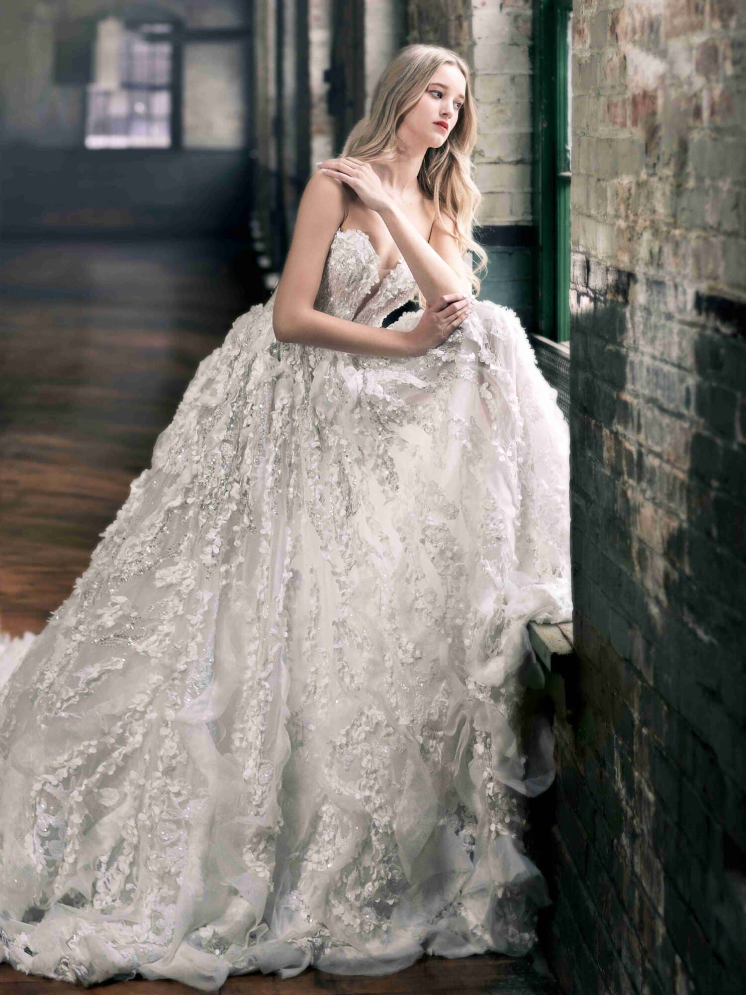 This wedding gown showcases cap sleeves, adorned with a scallop and textured design that gradually tapers at the sweetheart plunge neckline. The thoughtful detailing on the sleeves adds a touch of delicacy and sophistication, enhancing the overall charm of this bridal ensemble.